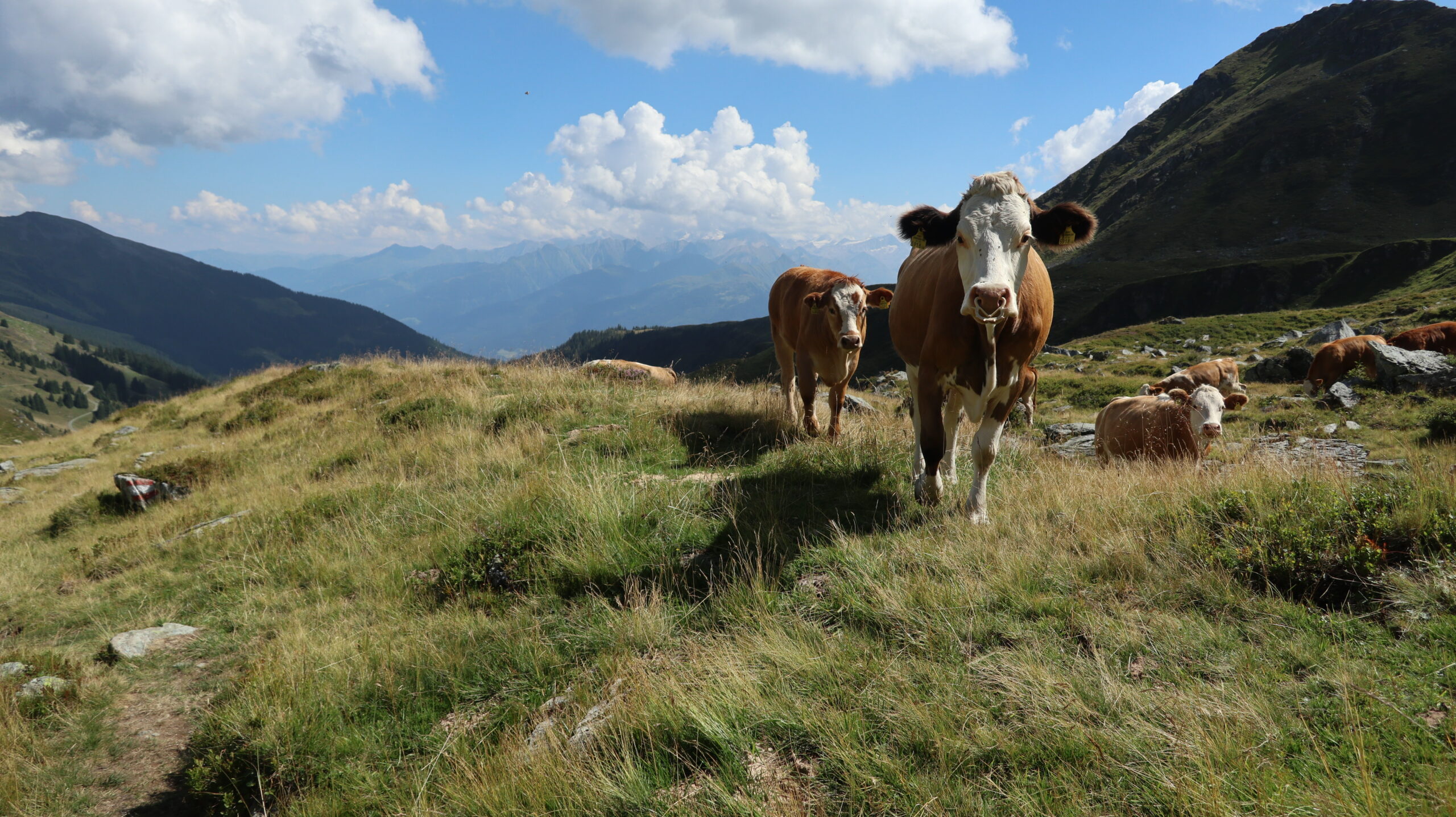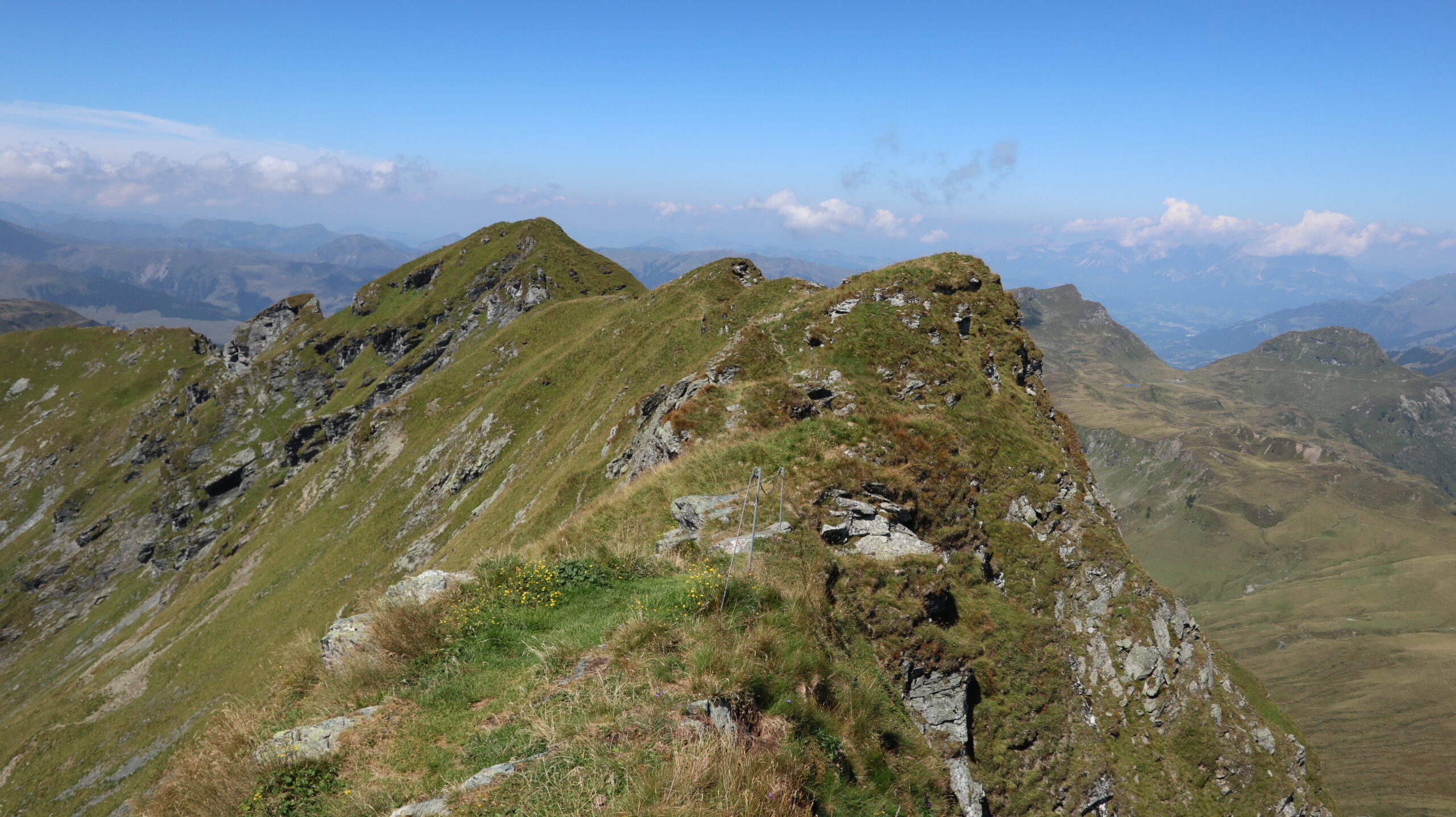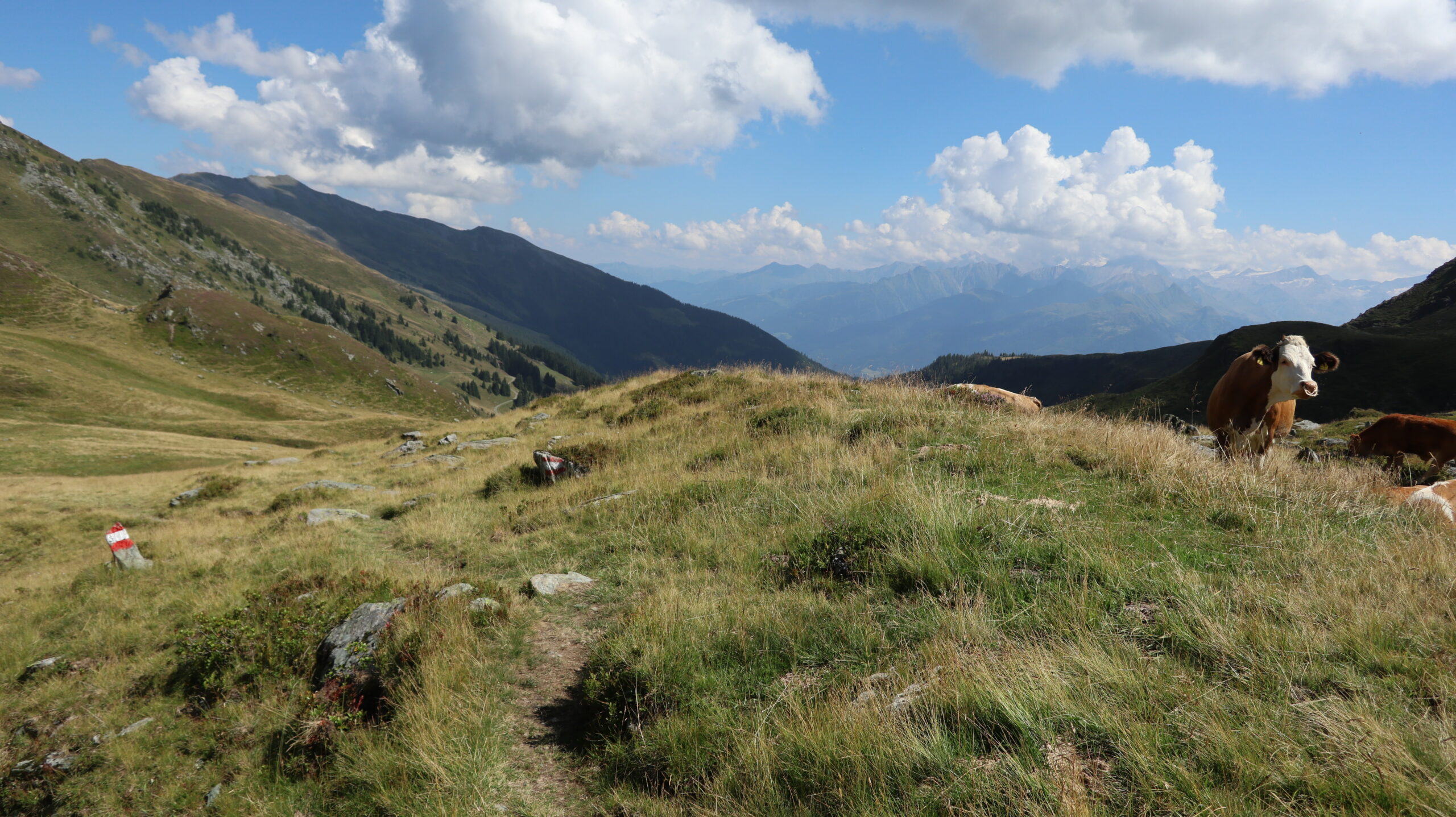 Für den Abstieg über den Westgrat (schwarzer Bergweg) wurden zwei kurze ausgesetzte Passage mit einem Geländer gesichert. Abgesehen davon führt der Weg weiter durch weitläufige Kuhweiden zur Sintersbachscharte. Von der Scharte streben wir schließlich zurück zur Bürglalm, zum wohlverdienten Abschluss dieser Almwiesen-Heidelbeeren-Panoramarunde.