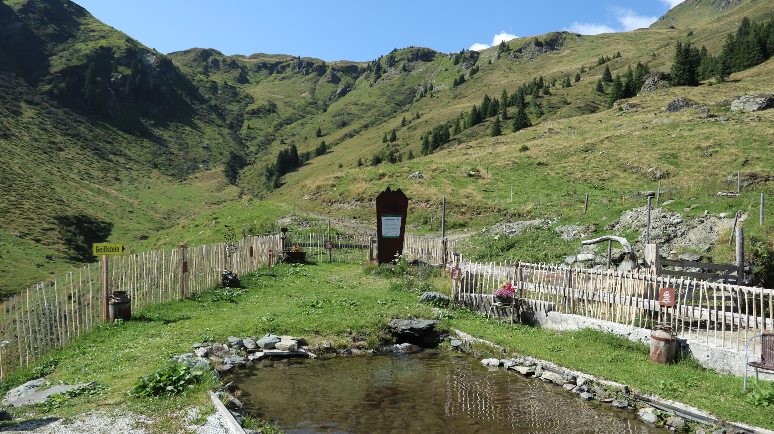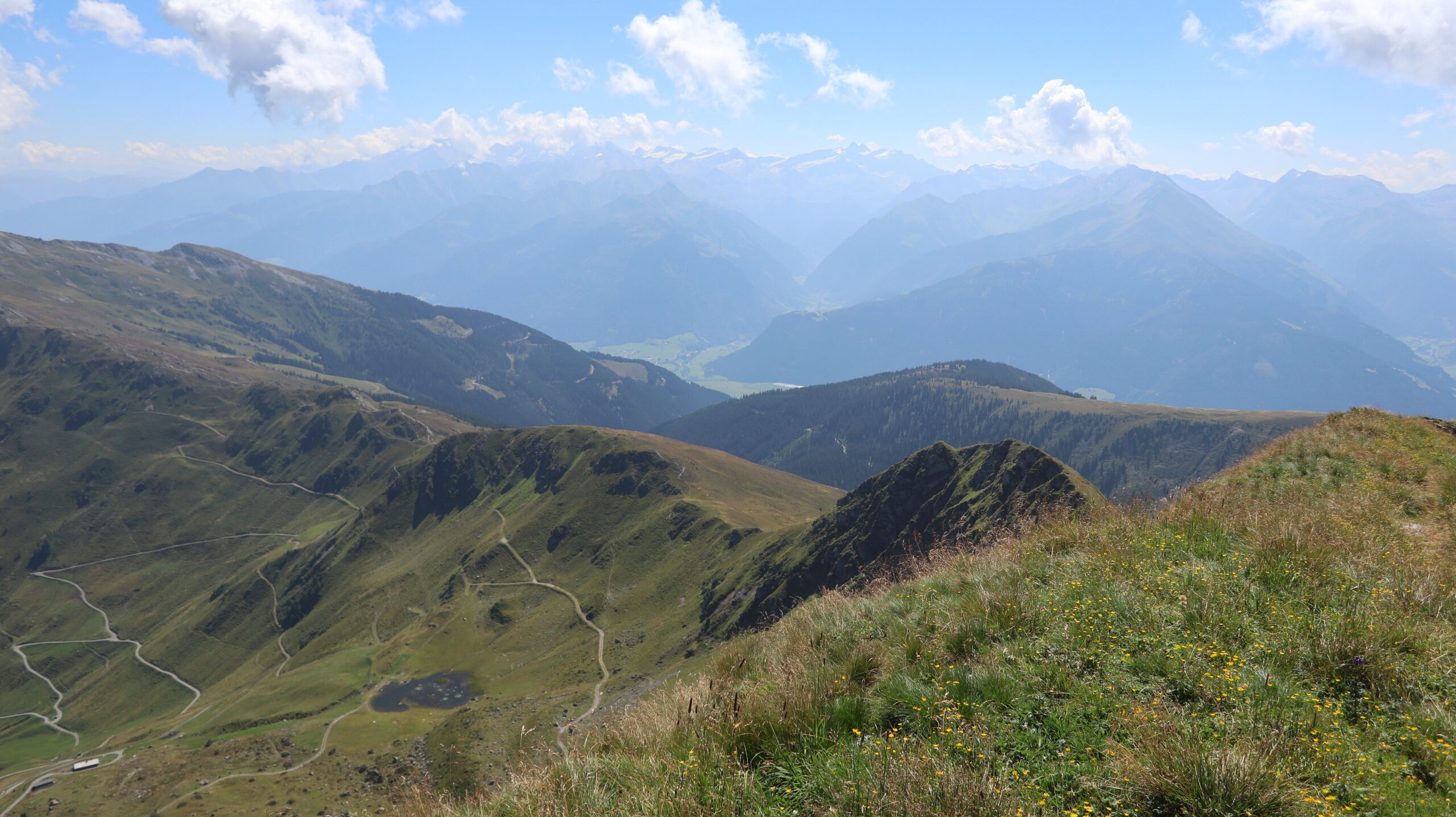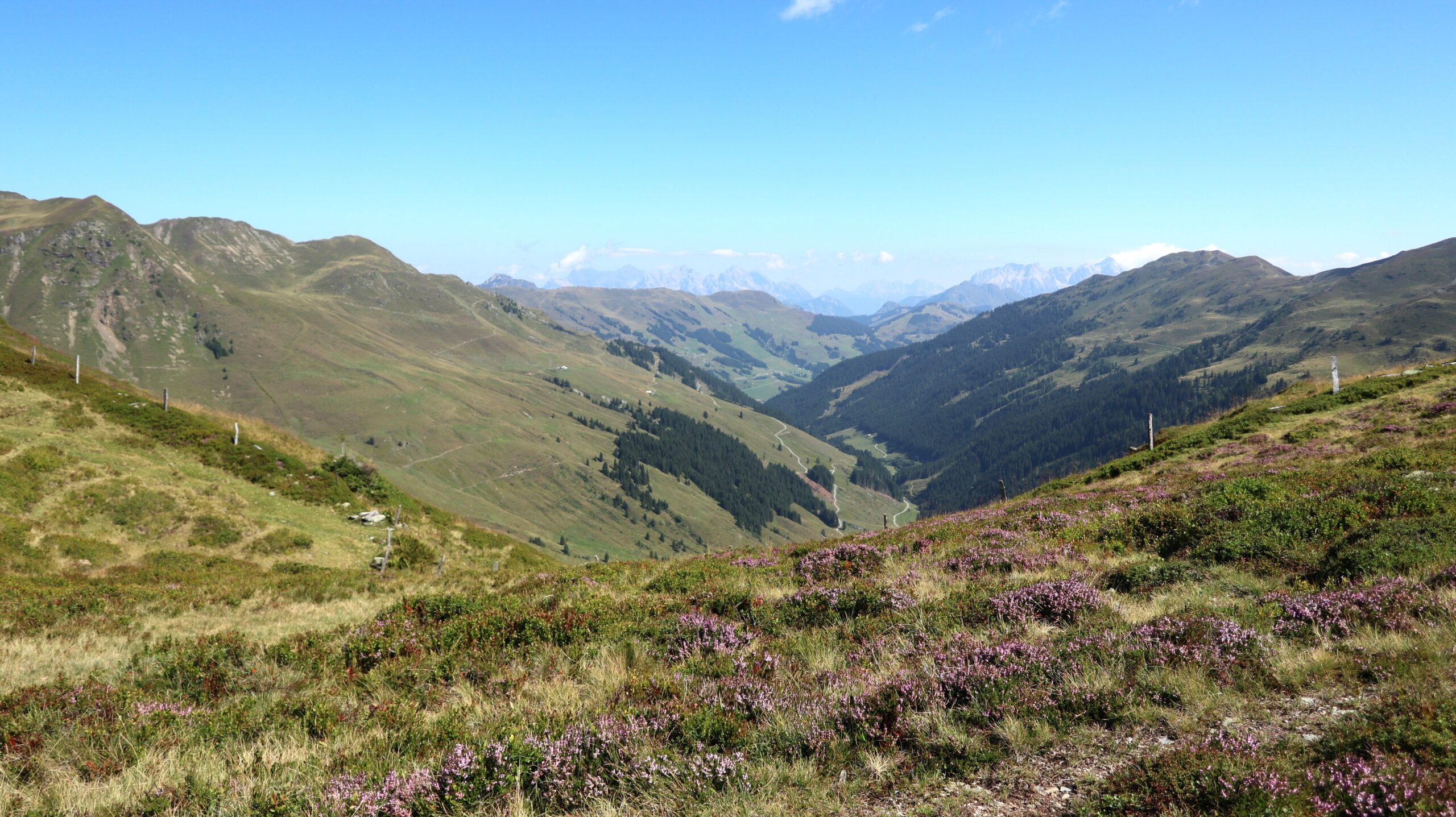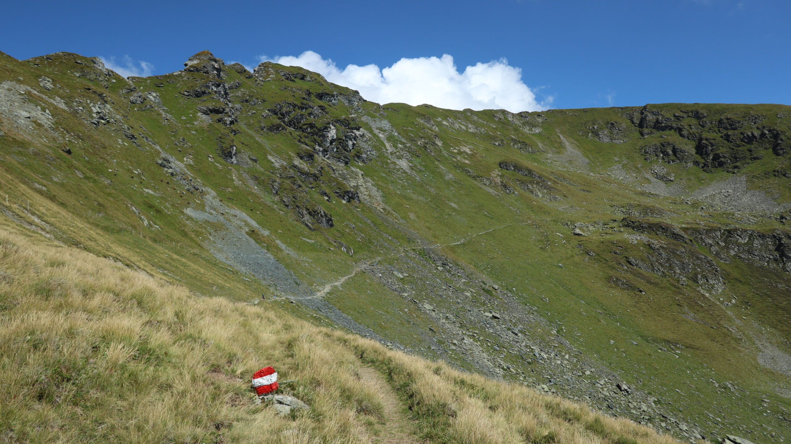 Für den Abstieg über den Westgrat (schwarzer Bergweg) wurden zwei kurze ausgesetzte Passage mit einem Geländer gesichert. Abgesehen davon führt der Weg weiter durch weitläufige Kuhweiden zur Sintersbachscharte. Von der Scharte streben wir schließlich zurück zur Bürglalm, zum wohlverdienten Abschluss dieser Almwiesen-Heidelbeeren-Panoramarunde.