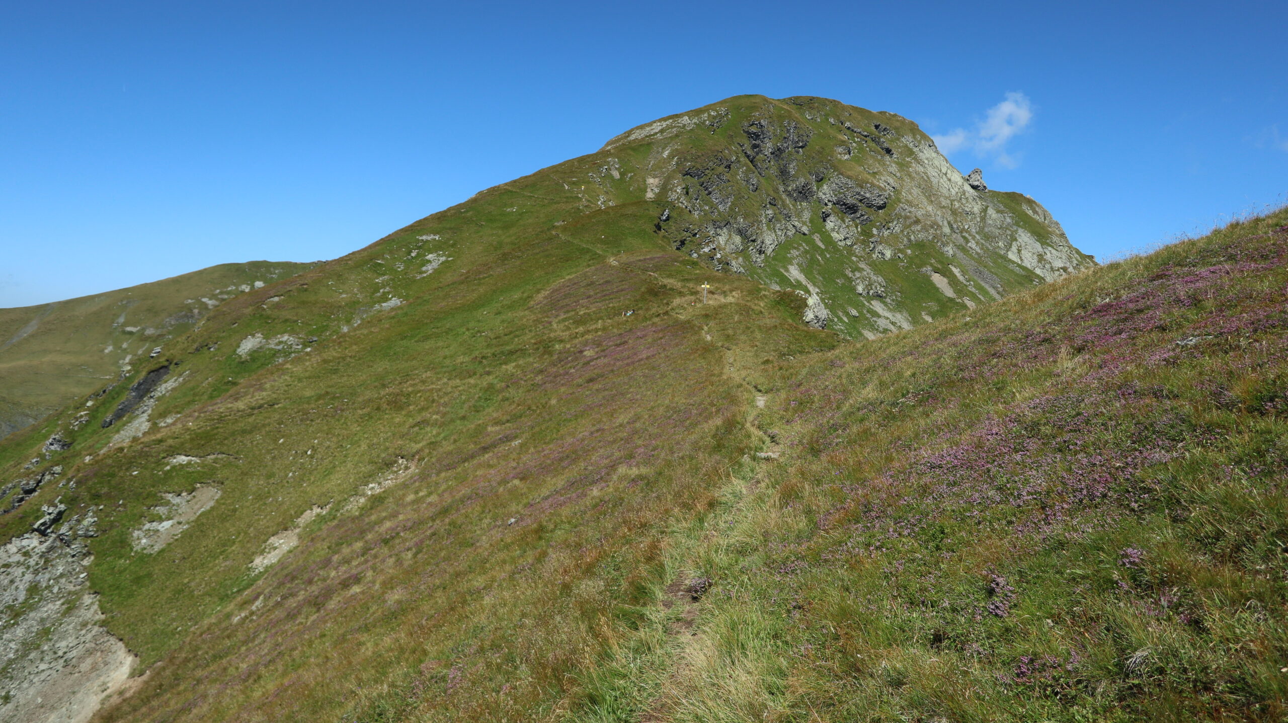 Startpunkt ist der Parkplatz der Bürglalm – der Wanderweg beginnt direkt auf der Hüttenterrasse. Zunächst folgen wir dem Direktweg zum Geißstein, bis zum ersten Abzweig. Dort nehmen wir den Weg zur Murnauer Scharte, der mit herrlicher Aussicht zu den Hohen Tauern über Almwiesen zur Scharte führt. An der Scharte wachsen zahlreiche Heidelbeeren, die im Spätsommer zum Naschen einladen. Weiter geht es zwischen den pink blühenden Erika-Sträuchern hinauf zum Leitenkogel. Anschließend wird der Weg kurz etwas anspruchsvoller (T3): Ein steiler Hang muss überwunden werden, bevor die schmale Spur über einen abschüssigen Hang zur Kreuzung mit dem Normalweg führt. Auf dem Südgrat geht es dann unkompliziert zum Gipfel.