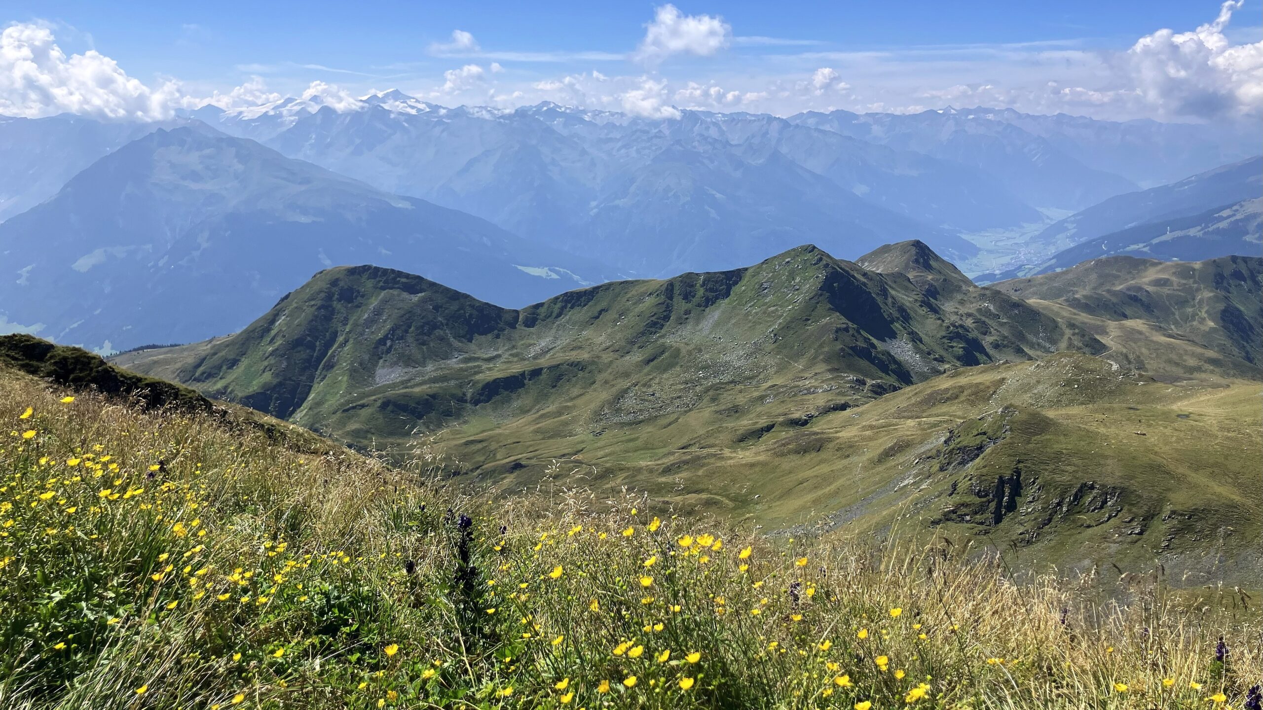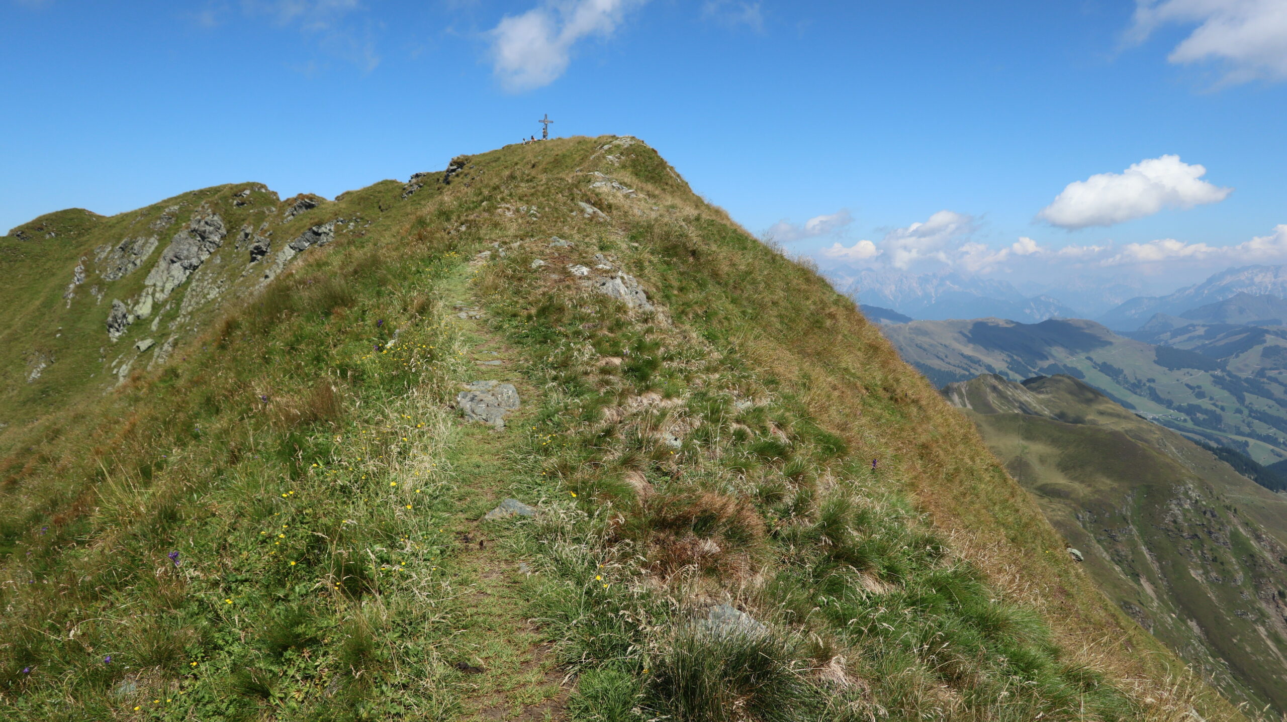 Fährt man mit dem PKW bis zur Bürglhütte, wird die Besteigung des Geißsteins zu einer angenehmen Halbtagestour, bei der genügend Zeit für eine gemütliche Einkehr auf der sonnigen Hüttenterrasse bleibt. Der Geißstein (2.363 m) zählt zu den Pinzgauer Grasbergen, die den südlichsten Teil der Kitzbüheler Alpen bilden. Wie der Name dieser Gebirgsgruppe schon verrät, handelt es sich hier vorwiegend um sanfte, grasbewachsene Höhenzüge, die sich ideal für aussichtsreiche Wanderungen eignen. Trotzdem ist der Geißstein kein bloßer „Grashügel“: Einige steilere Passagen verlangen Trittsicherheit, besonders im oberen Bereich. Der Aufstieg führt über weite Almmatten, auf denen im Sommer Kühe weiden, und bietet immer wieder beeindruckende Ausblicke auf die Hohen Tauern im Süden. Im Spätsommer laden die zahlreichen Heidelbeersträucher am Wegesrand zu kleinen Pausen ein. Am Gipfel eröffnet sich ein 360-Grad-Panorama, das vom Großvenediger über die Loferer und Leoganger Steinberge bis hin zum Wilden Kaiser reicht – ein idealer Aussichtspunkt für alle, die ohne technische Schwierigkeiten hoch hinaus wollen. Die Rundtour über den Geißstein ist somit eine perfekte Kombination aus entspannter Wanderung, alpin-landschaftlichem Erlebnis und kulinarischem Genuss – sei es durch die heimischen Heidelbeeren unterwegs oder ein Stück Kuchen auf der Bürglhütte zum Abschluss.