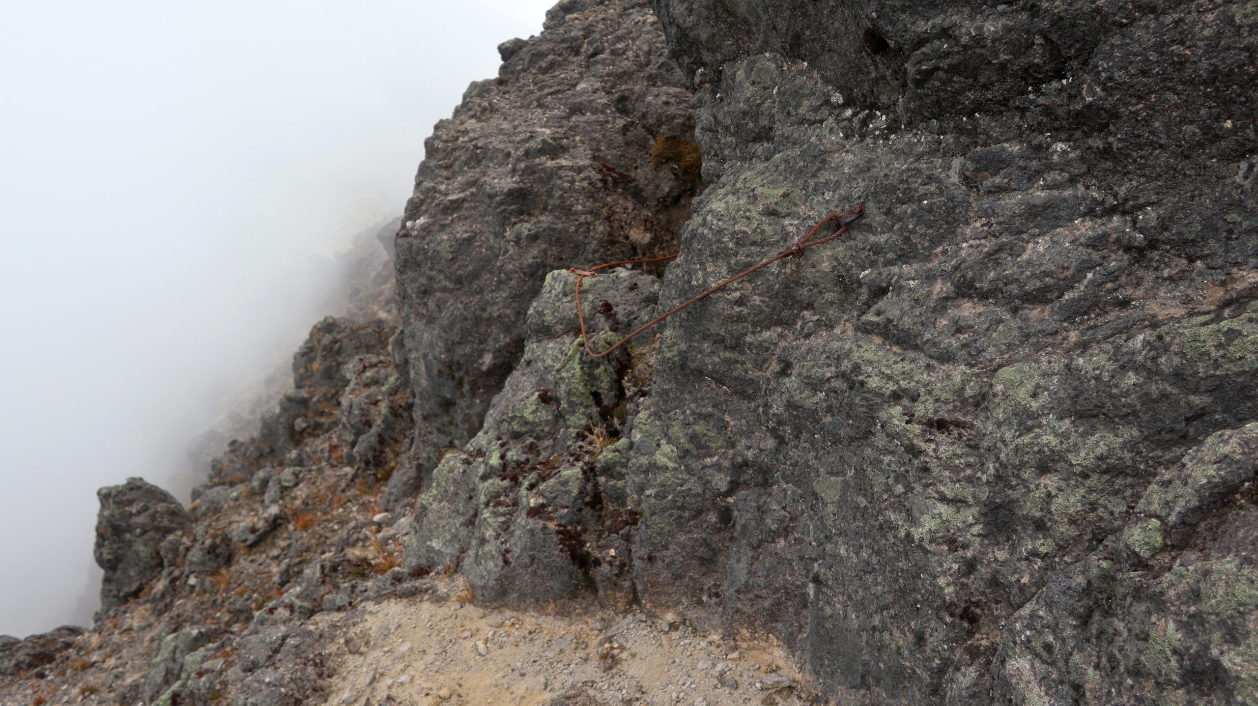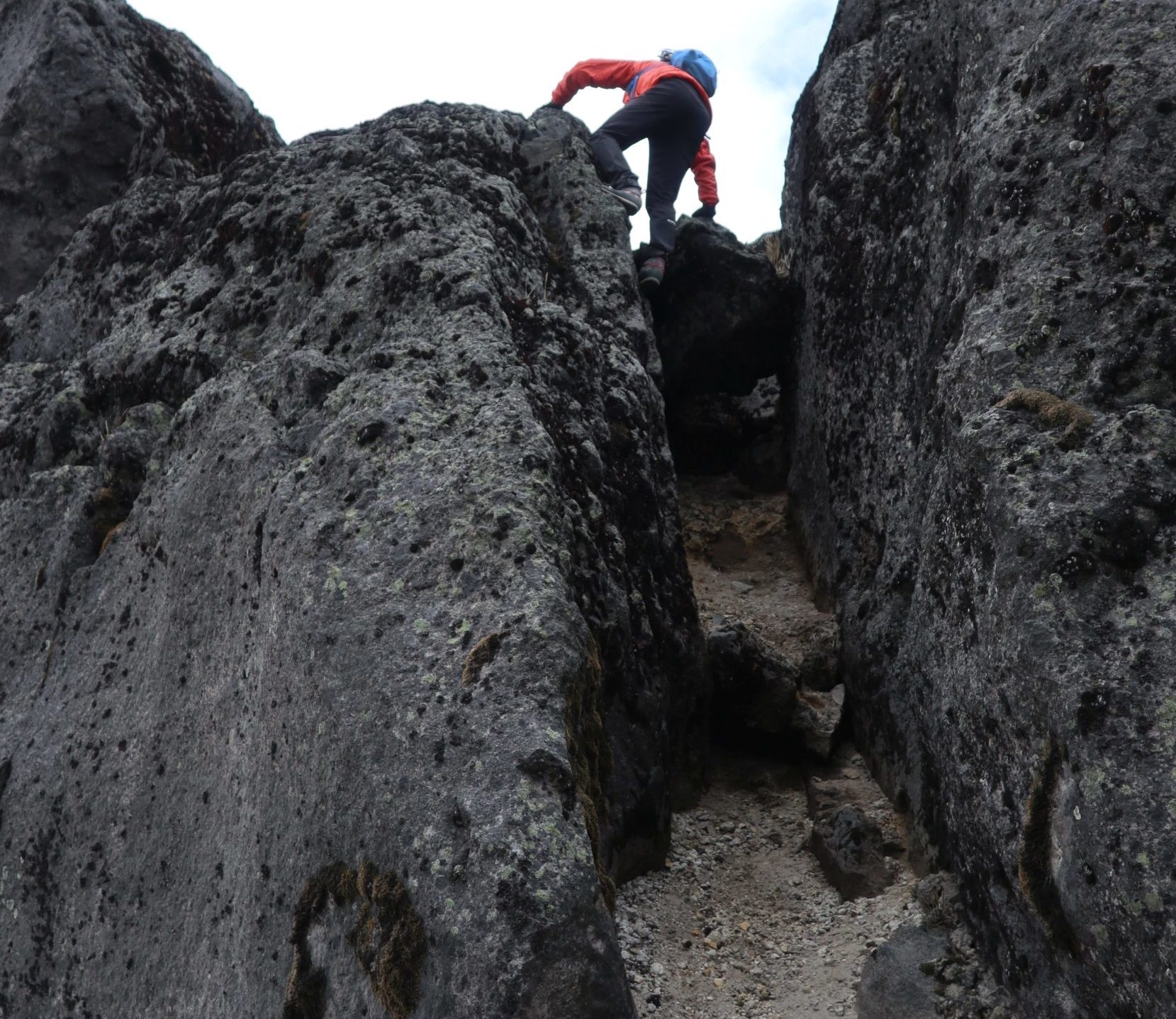 Will man die Tour fortsetzen, folgt man dem Pfad zum südlichen Vorbau des Nordgipfels. Dieser schwarze Basaltfels lässt sich ebenfalls durch einen Kamin erklettern (II, etwas anspruchsvoller als der Kamin am Hauptgipfel). Darüber gelangt man auf ein kleines Plateau mit Basaltsäule und folgt einer Pfadspur nach rechts. Steinmänner zeigen an, wo man die Ostflanke hinaufkraxeln muss. Oben angekommen, erreicht man wieder ein helles Sandfeld, über das es auf die nächste Felsstufe zu geht. Hat man diese erkraxelt, ist der Nordgipfel erreicht. An zwei Stellen gibt es sogar alte Drahtseilversicherungen, denen man aber nicht unbedingt trauen sollte. Der Rückweg erfolgt anfangs auf dem Hinweg und nach Erreichen des Abstiegs vom Hauptgipfel weiter auf dem Querpfad unterhalb der Felsen.