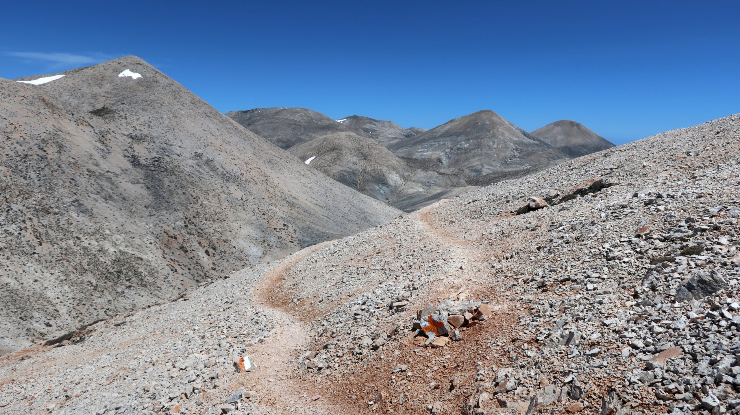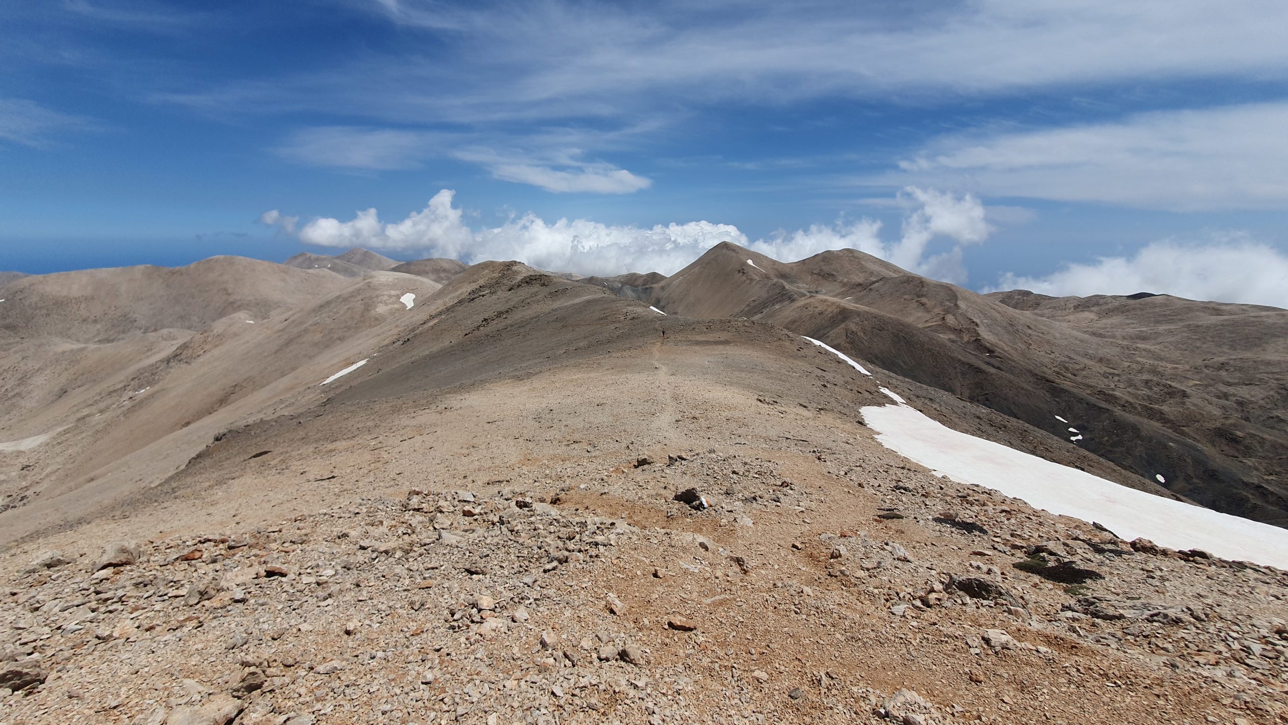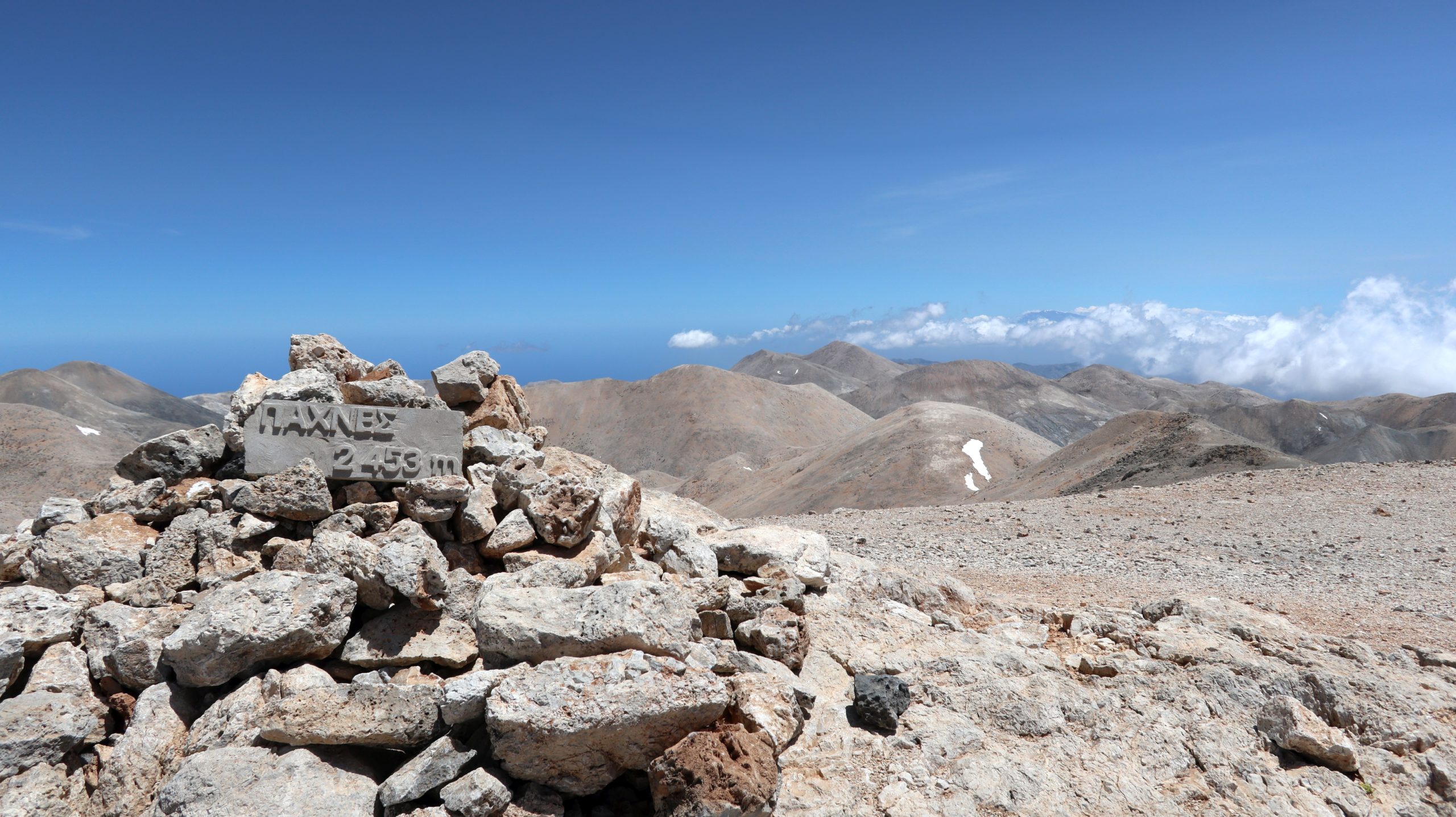 Den Ausgangspunkt der Tour erreicht man mit einem Geländewagen von Anopoli. Die ca. 1-stündige Anfahrt über die 18 km lange Schotterpiste ist ein Abenteuer für sich und nur erfahrenen Autofahrern zu empfehlen. Die Wanderung vom Ende der Schotterpiste zum Pachnes ist kurz und einfach: Man kraxelt bei den roten Pfeilen neben der Strasse eine Felsstufe hinauf und gelangt über einen Pfad zu schwarzen Felsplatten, die überquert werden. Damit ist auch schon der schwierigste Teil der Tour geschafft. Danach führt ein sehr gut markierter und ausgetretener Pfad über gut gesetztes Geröll zum Rousies-Pass. Von dort geht es über einen breiten Rücken unter den Gipfel Gavala. Der Weg quert in Folge unterhalb des Kamms, der Gavala und Pachnes verbindet, entlang. Achtung, hier können sich bis in den Mai hinein Schneefelder halten (Nordexposition). Schliessich erreicht man den wenig markanten Ostgrat des Pachnes und steigt zum Gipfel auf. Vom Gipfel eröffnet sich ein umfassender Blick auf die weisse Mondlandschaft bis zur Küste des Lybischen Meeres. Die Rückkehr erfolgt auf dem Hinweg.