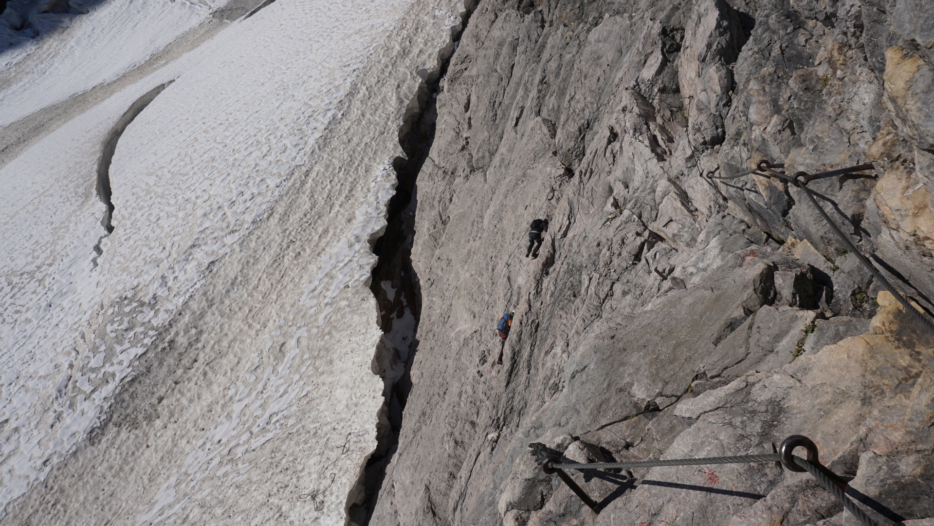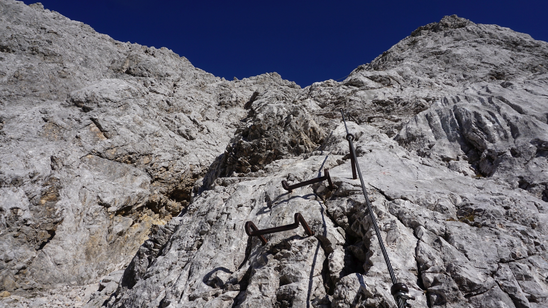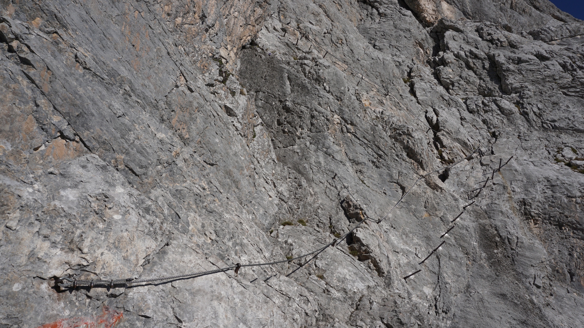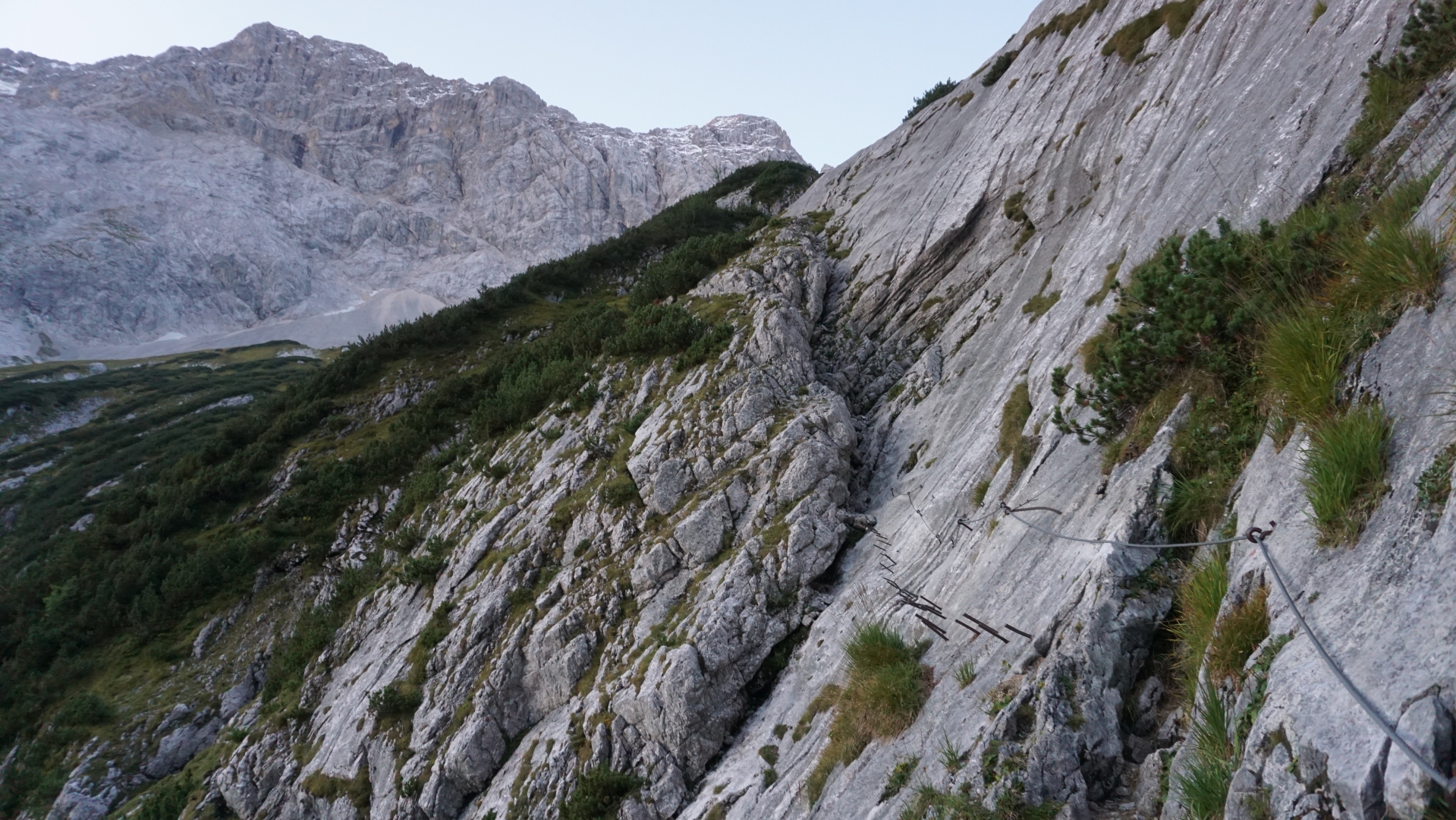 Um vor der breiten Masse loszukommen, breche ich vor der offiziellen Frühstückszeit (ab 6 Uhr) auf. Netterweise bekommt man als Frühaufsteher ohne Aufpreis ein Thermofrühstück bereitgestellt. Die erste bin ich aber doch nicht, zu meiner Überraschung sehe ich von der Hüttenterrasse schon Lichter an der ersten Steilstufe und am Höllentalferner herumgeistern. Im Schein der Stirnlampe geht es zum unteren Teil des Klettersteigs, dem sogenannten Brett. Wie geplant erreiche ich die erste versicherte Passage gerade als es dämmert. Dort treffe ich auf ein paar weiße Nike-Turnschuhe, die mich mit einem motivierten moinmoin begrüßen. Einen Pickel hat er seltsamer-weise am Rucksack, schon eine merkwürdige Kombination. Ich verkneife mir einen Kommentar gebe Gas, dass ich den Einstieg zur „Leiter“ vorher erreiche. Mit Stöcken in der Hand nehme ich die erste A/B-Passage, merke aber schnell, dass es nun besser ist, die Stöcke gegen das Klettersteigset einzutauschen. An der langen Eisenbügelleiter kommt die Sicherung erstmals zum Einsatz, da die Felswand von Wasser überlaufen ist. Bereits hier offenbart sich der schlechte Zustand des Klettersteigs, mittendrin fehlt ein Bügel. Es folgt das oft fotografierte Brett, die Querung einer senk-rechten Felswand auf Stahlstiften mit ziemlich viel Luft unter den Füßen. Gerade als ich im ersten Drittel bin, saust etwas über meinen Kopf hinweg – pfffrmmm. Mein erster Gedanke: Eine Bergdohle im Sturzflug? Pfffrmmm – mein zweiter Gedanke: Ein Depp fliegt schon Drohne? Pfffrmmm – mein Dritter Gedanke: Autsch! Ich schaue hoch und sehe Steine fallen. Schneller Rückzug an dieser Stelle unmöglich, auf den Stiften kann man nicht einfach umdrehen. Also bleibt nur abzuwarten, bis die Geschosse aufhören. Der Steinschlag muss eine natürliche Ursache haben, denn der Weg führt nach dem Brett horizontal weiter in Gehgelände. Nach diesem unangenehmen Morgengruß des Berges bin ich froh, als ich nach einer kurzen, unversicherten Kraxelei (I) den grünen Buckel erreiche, wo man erstmal für eine Weile Gehgelände hat.