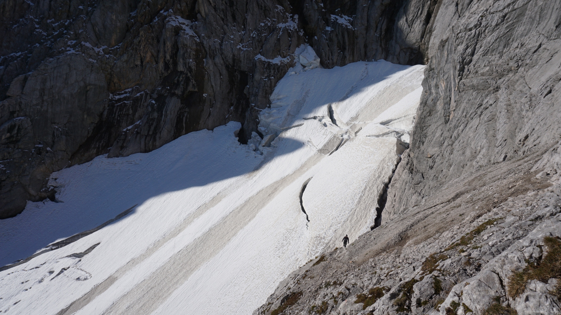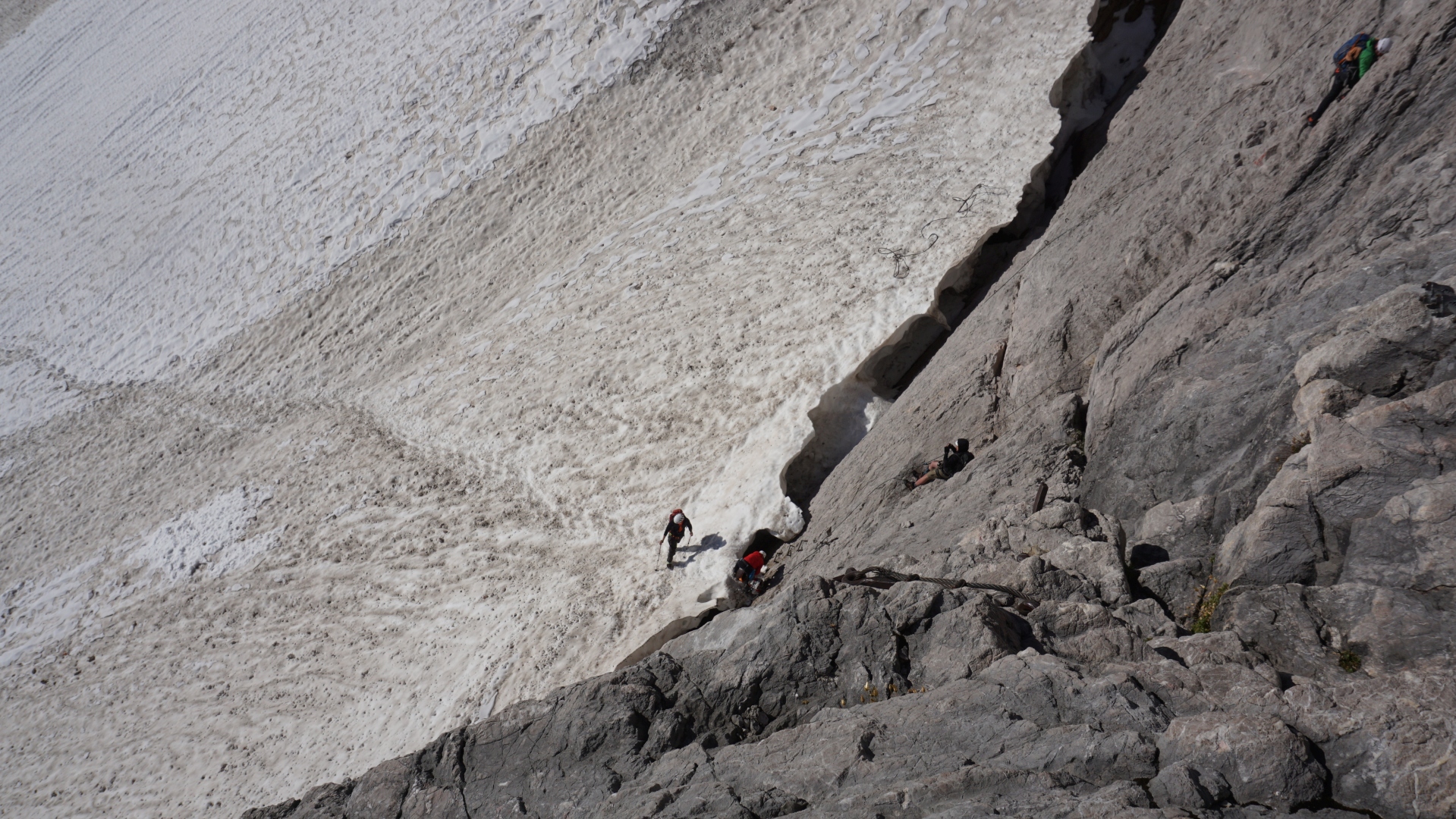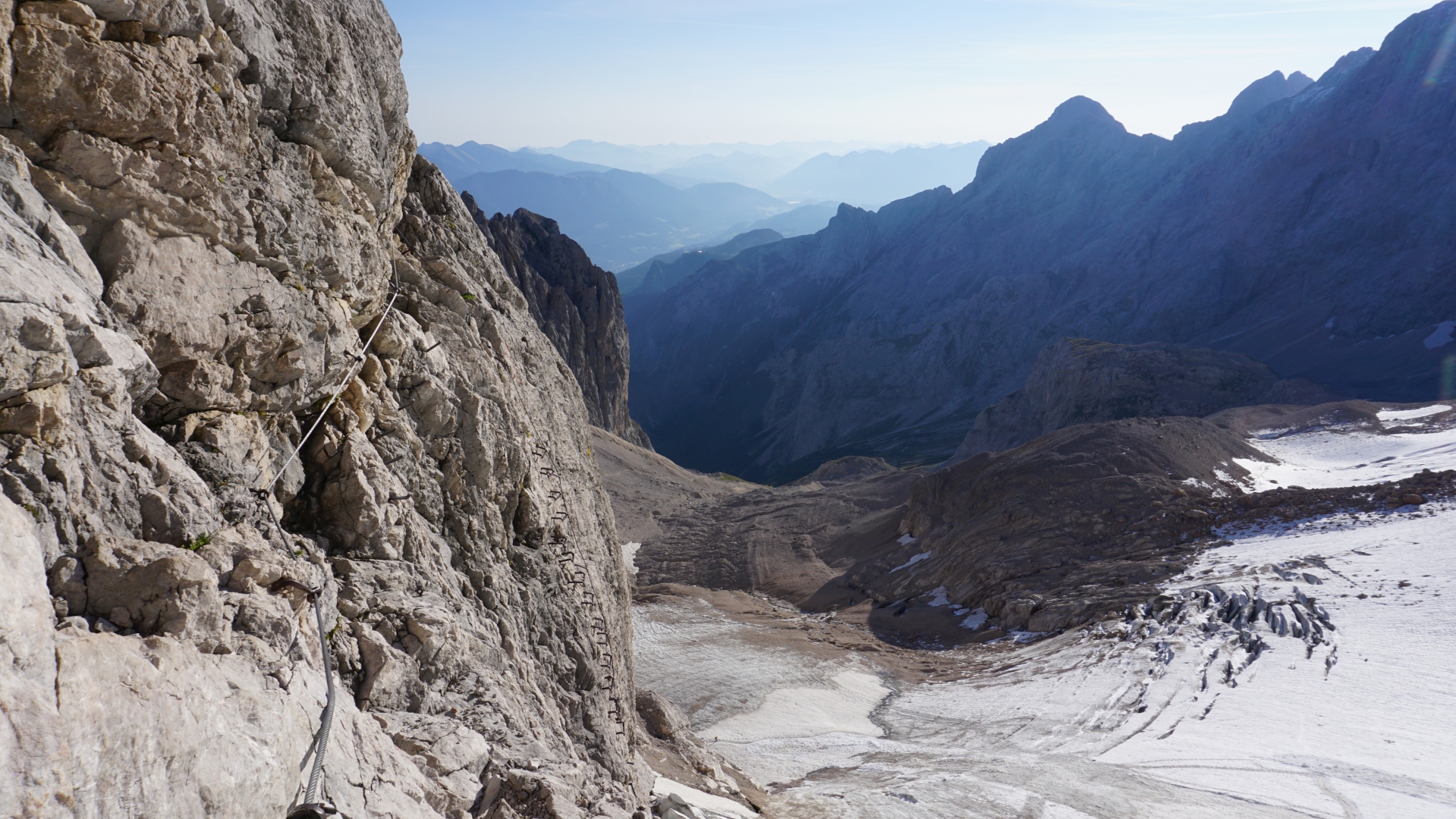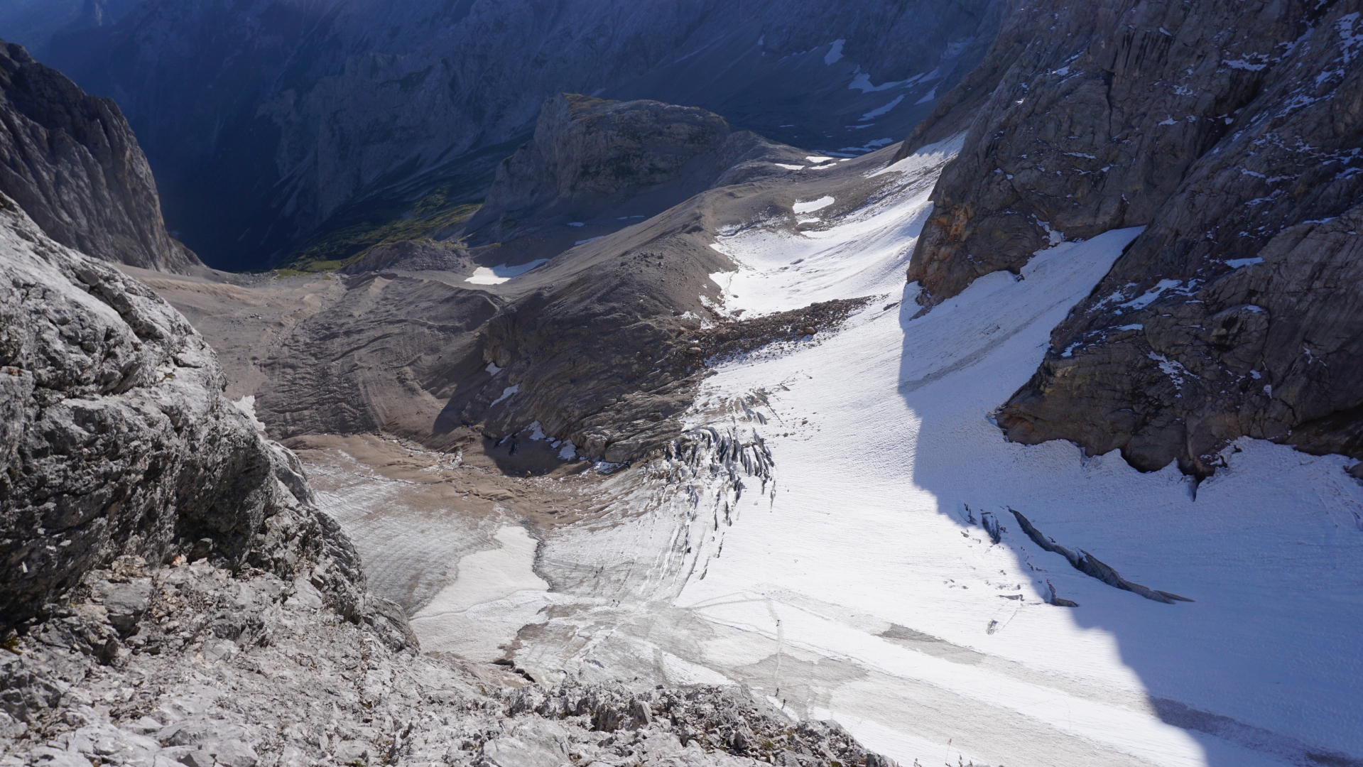 Ein guter Weg führt durch das Geröllfeld vor dem Höllentalferner. Hier treffe ich erstmals wieder auf Menschen, eine Zweiergruppe legt gerade Steigeisen an und eine weitere müht sich gerade auf dem Gletscher ab. Wie sich herausstellt, hat er nur Grödeln, die in den Blankeistellen nicht so recht greifen. Ich bin höllisch froh, dass ich richtige Steigeisen dabeihabe, denn im Mittelteil er-reicht der Gletscher an die 30° (manche schreiben sogar 35°). Rutschen sollte man tunlichst nicht, denn der Höllentalferner hat ein paar Spalten. Nun folgt der anspruchsvollste Teil der Tour, der Übergang vom Gletscher auf die senkrechte, griffarme Felswand. Stahlkabel und Eisenbügel helfen die Felswand hinauf (B/C). Je nach Jahreszeit gibt es zwischen Gletscher und Fels eine mehr oder weniger breite Randkluft zu überwinden. Es gibt zwei Übergänge, der untere Übergang ist eine schöne Eisenleiter, der obere Übergang oder besser gesagt die oberen beiden bestehen einmal aus einem Seil über eine senkrechte, glatte Platte und noch etwas weiter oben ein paar vereinzelten Bügeln. Heute ist der Übergang dank einer Schneebrücke nur an dem Stahlseil ohne Tritthilfen möglich, an den andern beiden Punkten ist das Eis zu weit weg von der Wand. Den ersten Teil klettere ich mit Steigeisen, abziehen traue ich mich auf dem steilen Gletscher unterhalb der Wand nicht, da man von dort leicht in eine Spalte rutschen kann (passiert anscheinend öfter).