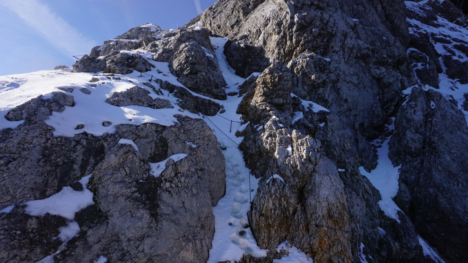 Nachdem ich mich am Seil über die schräge Platte hochgezogen habe, ziehe ich die Steigeisen auf einem kleinen Absatz ab. Anspruchsvoll geht es weiter, auf Eisenstiften muss man um eine abdrängende Felsnase herum und sich dabei leicht nach hinten hängen (daher B/C). Danach sind die technischen Schwierigkeiten geschafft, nach der Querung eines Geröllfeldes folgen nur noch A/B Passagen. Um schneller voranzukommen, hänge ich mich nur noch an den exponiertesten Stellen ein, das Gelände ohne die Kabel wäre T5. Die Seilbahnstation wirkt schon zum Greifen nahe, doch der Aufstieg zieht sich. Über den „Pfeiler“ gelangt man schließlich zur Irmerscharte auf dem Riffelwandkamm. Ab dieser Scharte wird es winterlich, der Steig ist von harschigem Schnee bedeckt. Die Seile wurden zum Glück zum Großteil schon aus dem Schnee befreit, sodass der Aufstieg kein Problem mehr ist. Nach dem Abzweig zum Jubiläumsgrat ist man schnell am Gipfel.