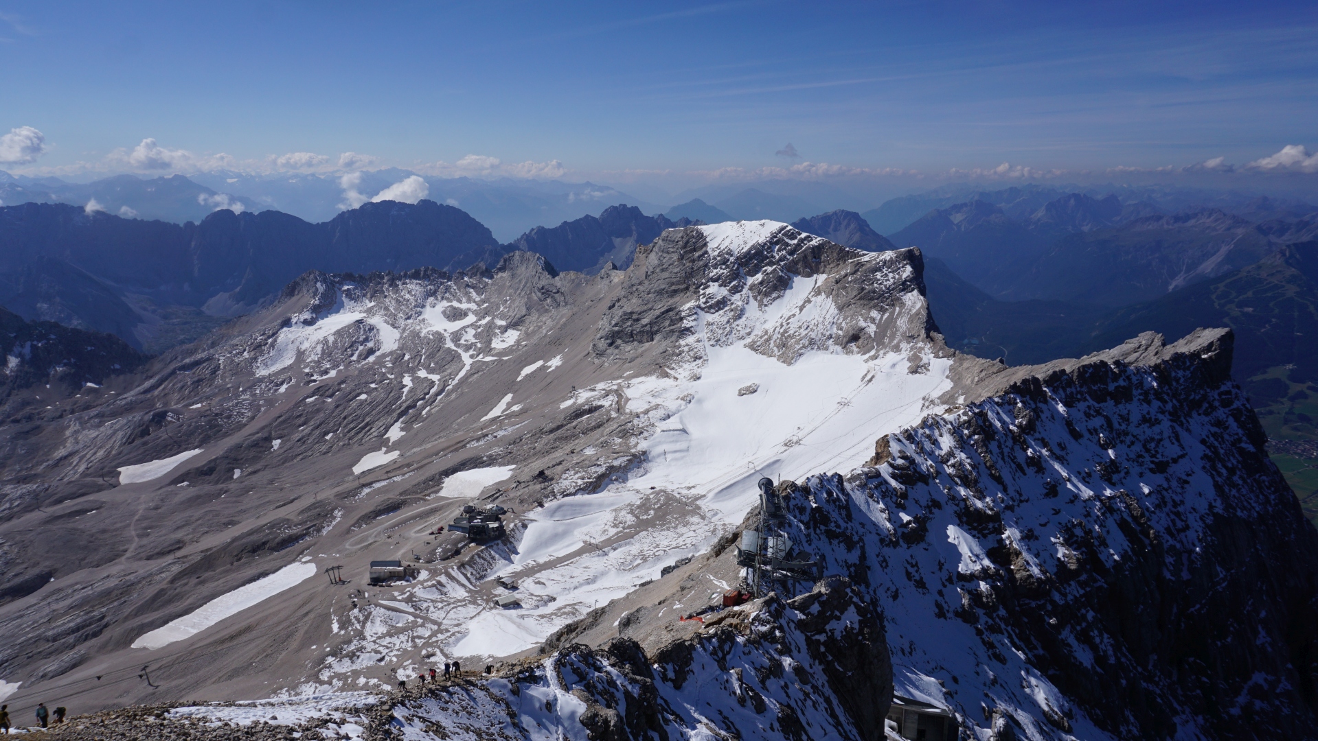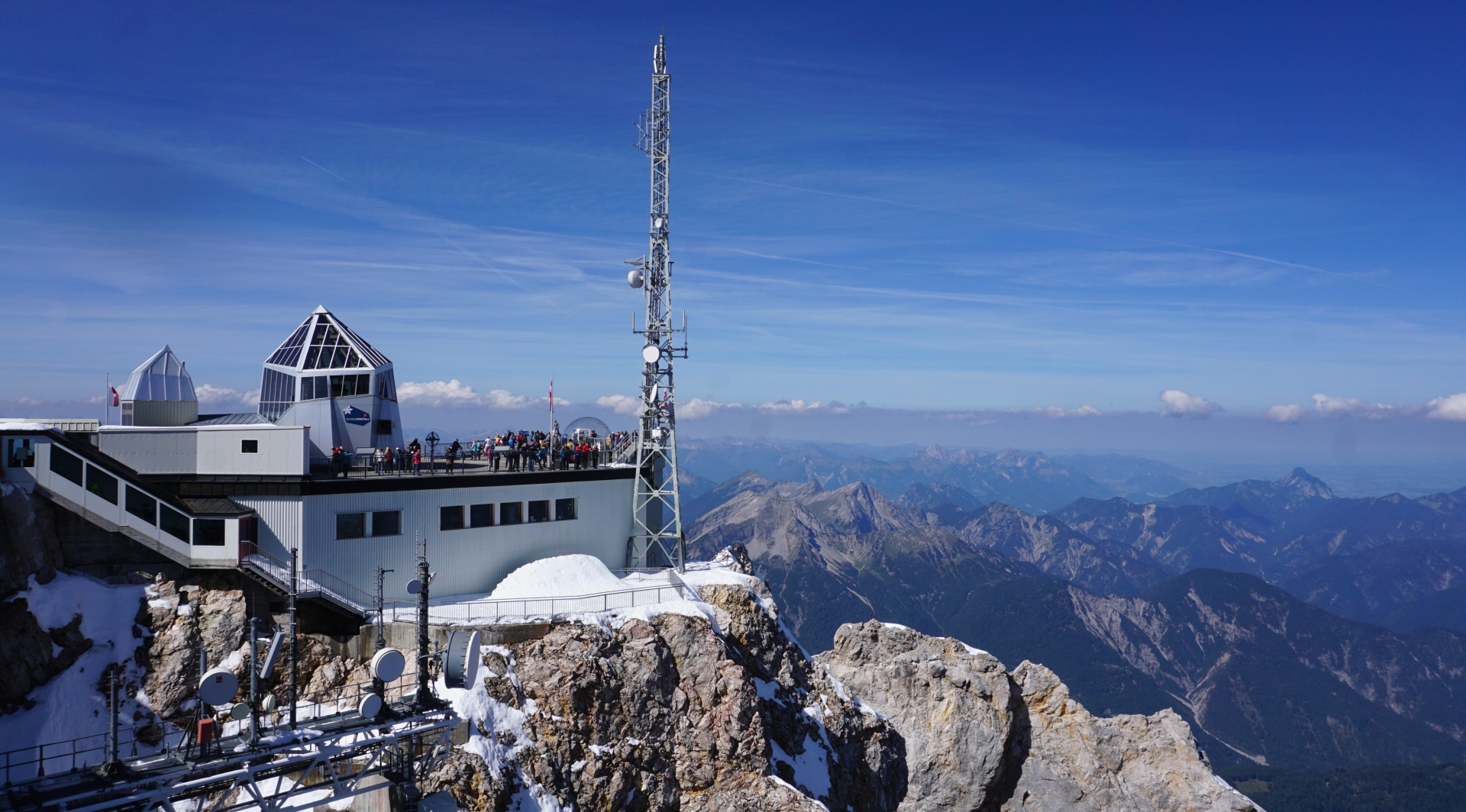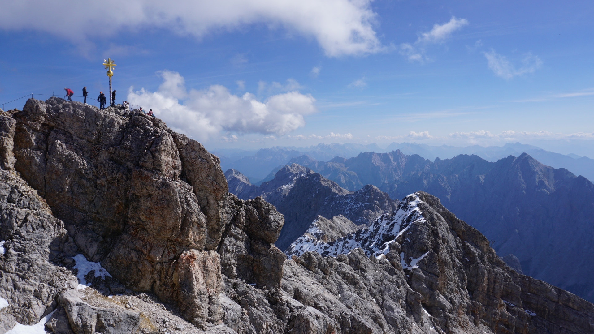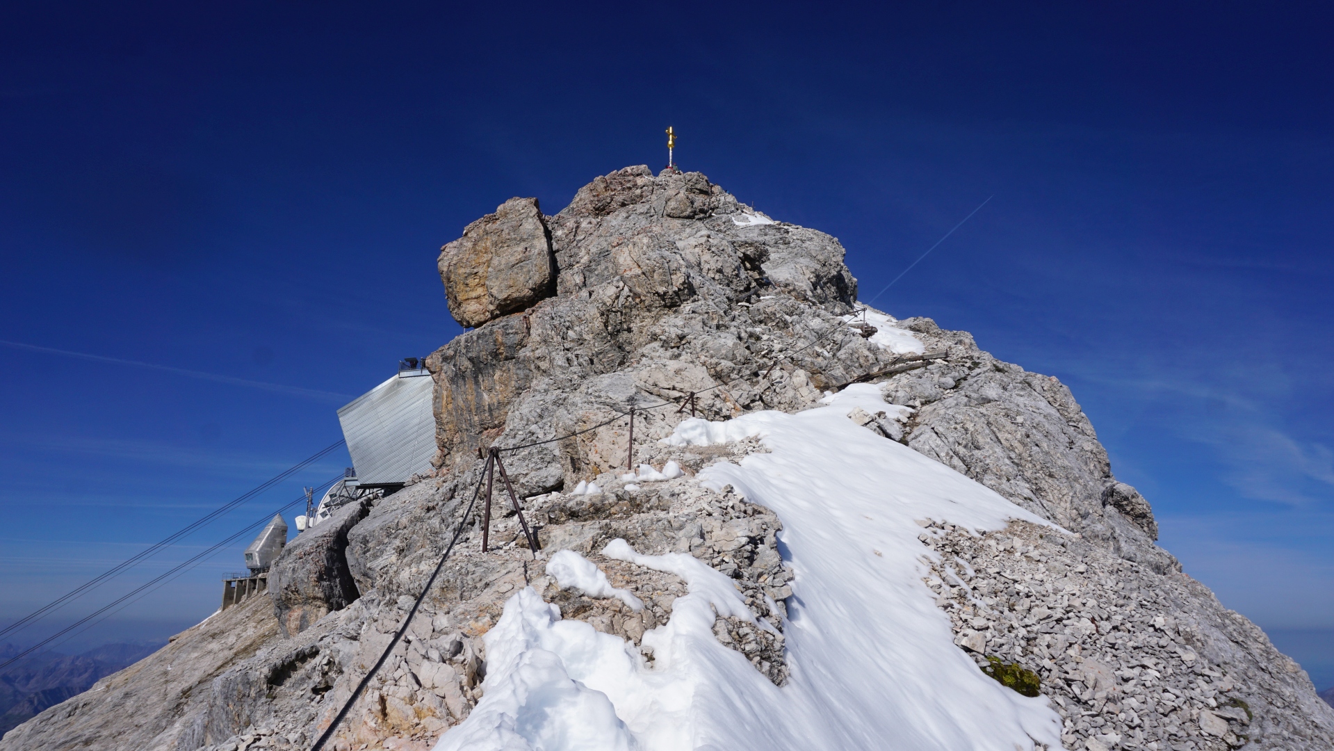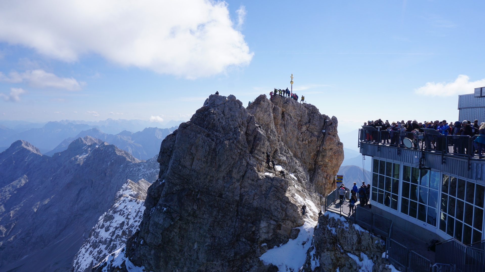 Hier erlebe ich den schon von vielen anderen beschriebenen «Kulturschock». Nach 4,5 Stunden Bergeinsamkeit und körperlicher Anstrengung landet man Mitten im Massentourismus. Turnschuhtouristen mühen sich ab, durch den Schnee zum oder vom Kreuz herunterzukommen und blockieren sich dabei gegenseitig. Es geht nichts mehr vor und zurück. Es bräuchte echt einen Einweiser hier, der den Aufstieg koordiniert, dann hätten alle mehr Spaß! Nach dem obligatorischen Besuch beim Kreuz setze ich mich auf den schönen Nebengipfel, der komischerweise nicht von den Touristen besetzt wird. Die Aussicht ist leider nicht so großartig wie erwartet, die Gebäude auf dem Gipfel erlauben keinen 360° Rundumblick, wie ich es von einem solch prominenten Gipfel erwartet hätte. Nach einer Stunde Pause auf dem Gipfel fühle ich mich immer noch ziemlich müde und beschließe, mir noch schnell im Konsumtempel etwas Koffein zu holen. Beim Dallmayr bekommt man immerhin einen guten Kaffee, wenn auch zu Münchner Preisen. Mittlerweile geht es auf der Aussichtsplattform zu wie am Oktoberfest, ich finde weder einen Platz zum Sitzen noch einen freien Platz am Geländer mit Aussicht. Um Bilder zu machen, muss man sich durch die Massen kämpfen. Nachdem ich auch noch bei der Toilette anstehen musste, stelle ich entsetzt fest, dass ich mit der ganzen Warterei schon 2 Stunden verloren habe.