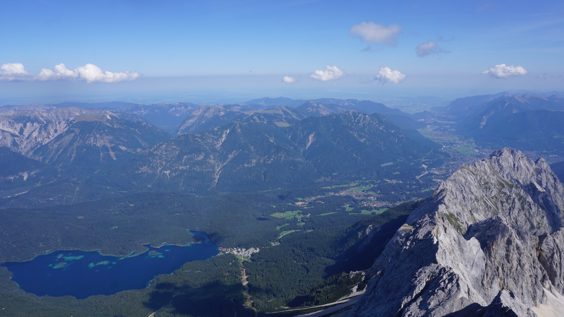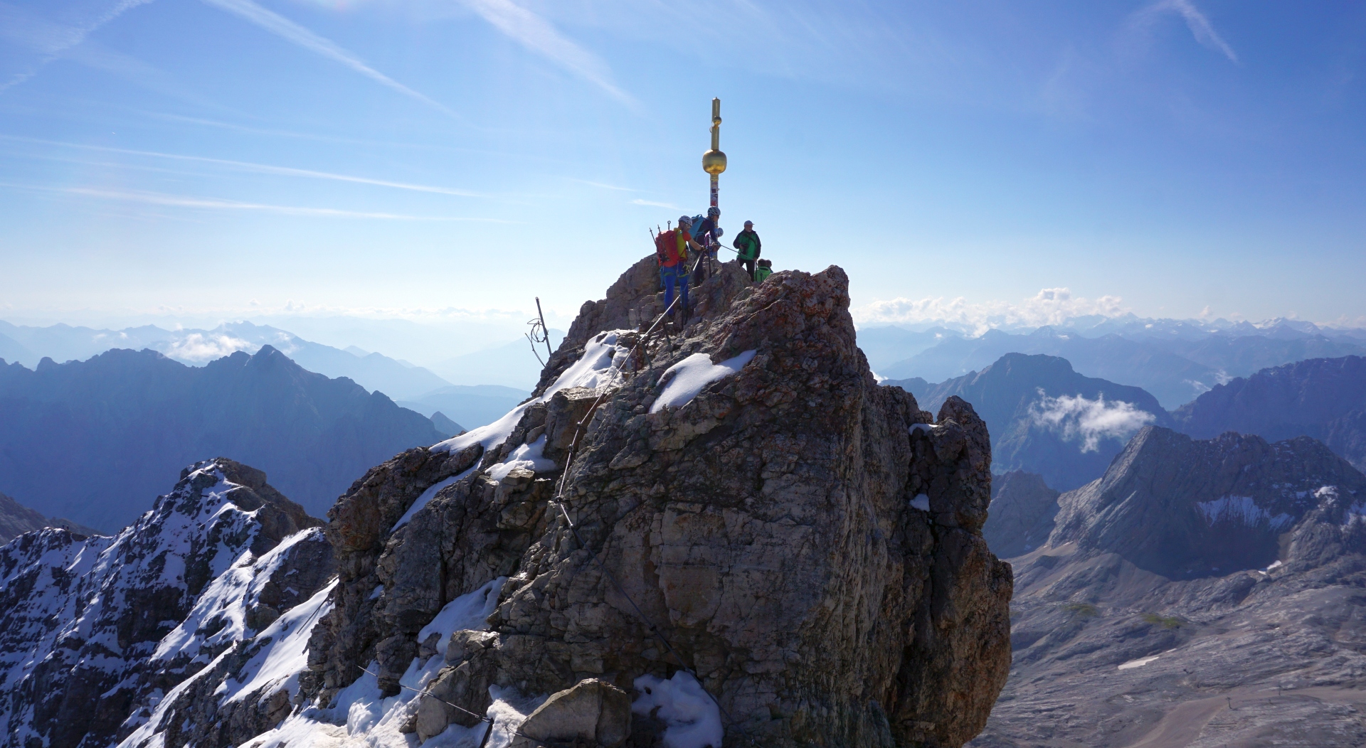 Nach der Besteigung der höchsten Berge von Italien, Slowenien und Lichtenstein war es schon fast eine Pflicht, als Bayerin endlich einmal den höchsten Punkt des Freistaates zu besuchen. Über die Besteigung der Zugspitze hatte ich schon viel Abschreckendes gelesen, von Staus am Klettersteig und überforderten Turnschuhtouristen am Gipfelkreuz. In der Hoffnung, das Risiko von Wartezeiten zu minimieren, entschied ich mich dafür, die Zugspitze unter der Woche und bei «leicht erschwerten Bedingungen», sprich etwas Schnee, zu besteigen. Von den vier Routen entschied ich mich für die zweitschwerste, aber angeblich schönste, den Höllentalsteig. Es ist schwierig, diese Route in eine Kategorie zu packen. Irgendwie ist es eine Mischung aus Kletter-steig, Hochtour und Alpinwanderung und man braucht Erfahrung in allen drei Bereichen. Als reiner Klettersteiggeher wird man auf dem Gletscher wenig Freude haben, gerade bei Blankeis braucht man schon etwas Gehtechnik mit Steigeisen. Erfahrung mit T4/T5-Gelände sollte man auch haben, um die Geröllpassagen und unversicherten Kraxelstellen zu meistern. Zum Glück ist der Klettersteig „oldschool“ und kein Drahtbügelverhau aka „Sportklettersteig“. Das Alter bedingt allerdings auch einen relativ schlechten Zustand der Sicherungen. Auf der gesamten Strecke habe ich über 20 ausge-rissene Bügel oder Zwischensicherungen gezählt und noch mehr Wackelkandidaten. Man sollte doch meinen, dass die zahlreichen in- und ausländischen Touristen, die diesen Berg besuchen, ge-nug Geld für eine Sanierung einbringen…. anyway, der Steig gilt zurecht als der schönste Weg auf die Zugspitze und wenn man früh genug dran ist, erlebt man auch keine Staus 😉