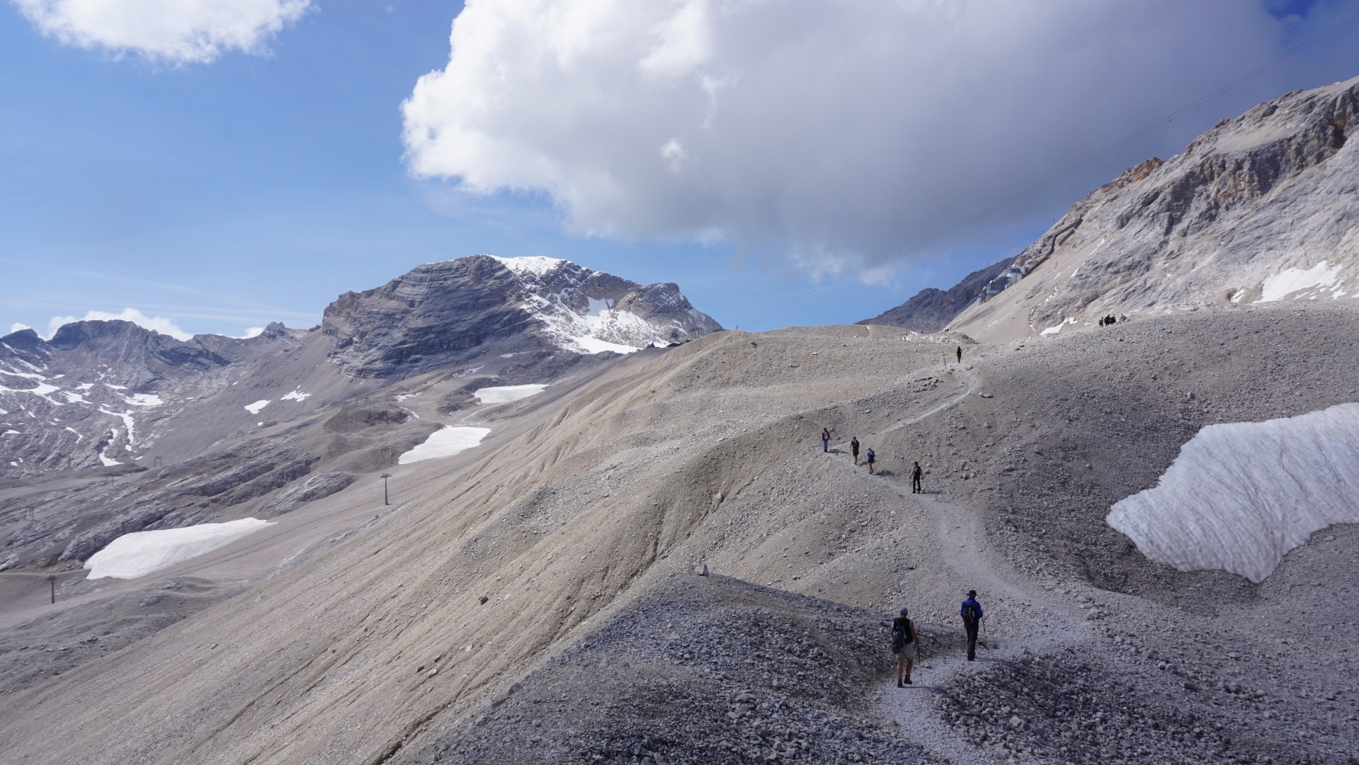 Über eine Treppe mit Warnhinweis vor alpinem Gelände und Absturzgefahr flüchte ich vor dem Trubel Richtung Zugspitzplatt. Doch der Zirkus nimmt kein Ende, ein nicht endend wollender Strom von Menschen quält sich den versicherten Steig vom Gletscherskigebiet herauf. Aus ihrer Ausrüstung schließe ich, dass auf dem schwarz markierten Steig wohl keine Schwierigkeiten mehr warten und entledige mich bei der Seilbahnstation meiner Klettersteigausrüstung. Über das öde Geröll laufe ich zügig Richtung Knorrhütte. Was für ein hässlicher und langweiliger Aufstieg der Normal-weg doch ist! Und wie überfordert manche selbst damit sind… Kinder, die auf dem Hosenboden dahinrutschen, weil sie nicht im Geröll gehen können und denen die Mami nebenbei eine Horrorgeschichte von Gewittereinbrüchen im Gebirge erzählt. Welch Ironie, merkt sie denn nicht, dass sie ihre Familie gerade selbst in eine Gefahrensituation gebracht hat?! Kurz vor der Knorrhütte über-hole ich noch einen übergewichtigen Asiaten mit vom Hinfallen zerrissener und dreckiger Hose, der sich wie in Zeitlupe abwärts bewegt. In der Zeit, die er braucht, die Hütte zu erreichen, habe ich schon ein Stück Marillenkuchen verdrückt. Wie ist der bloß hochgekommen? Es ist nun schon 15 Uhr und trotzdem machen sich immer noch Leute von der Hütte zum Gipfel auf. Es tut echt weh, das Ganze mitanzuschaun.