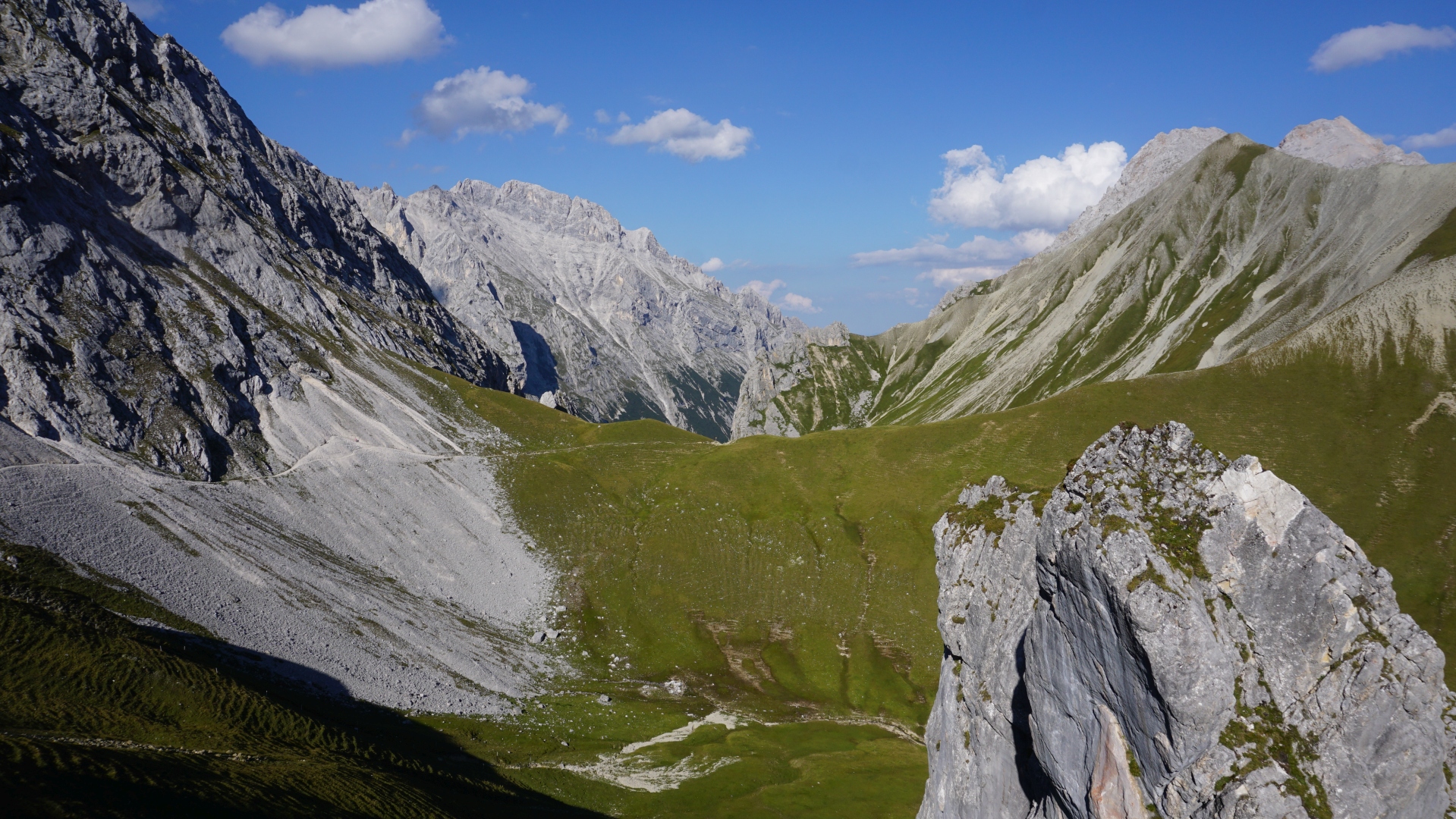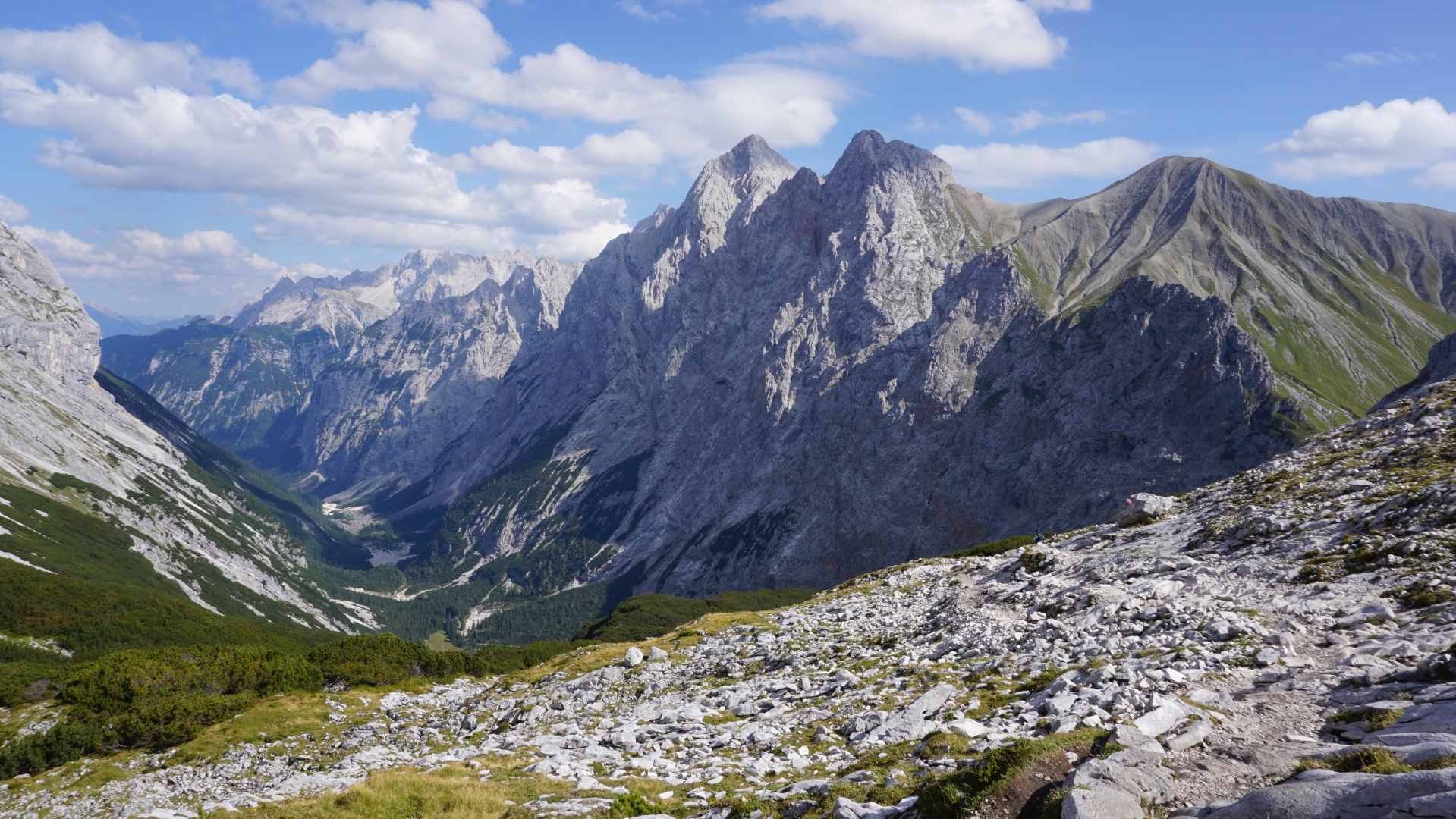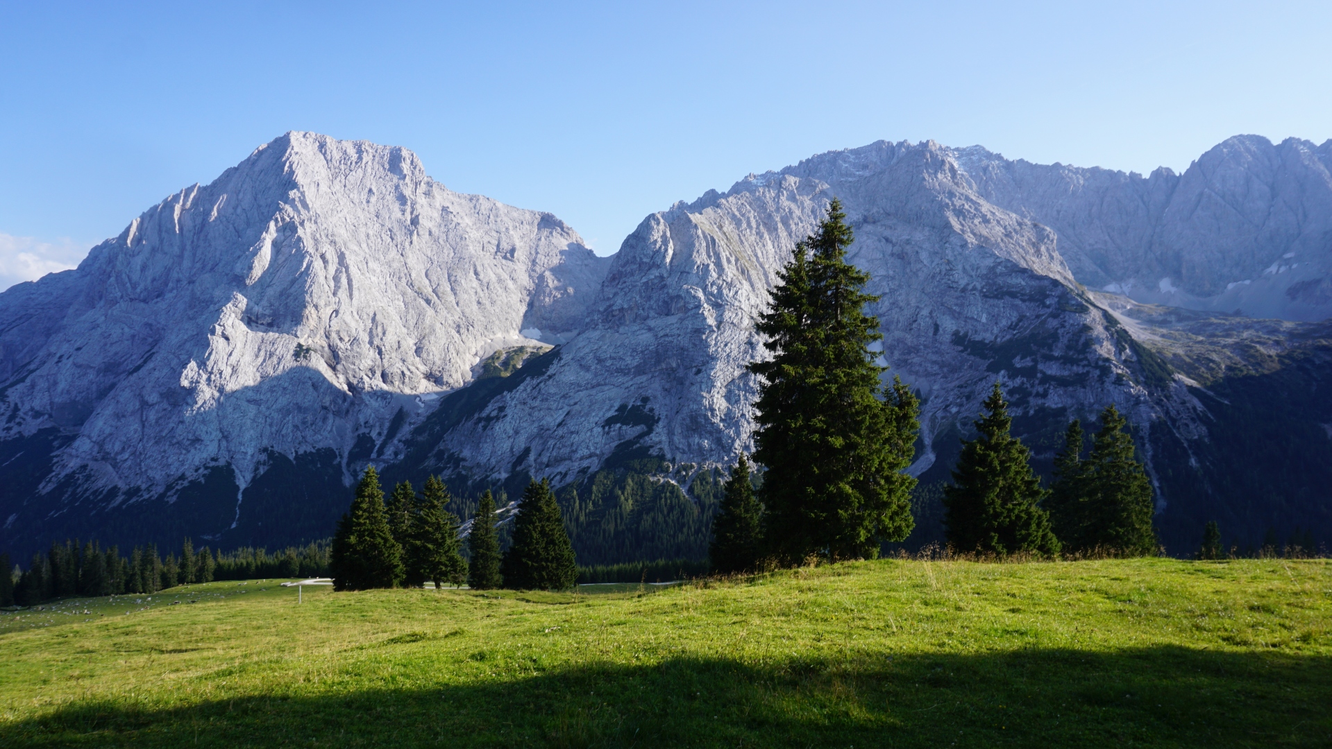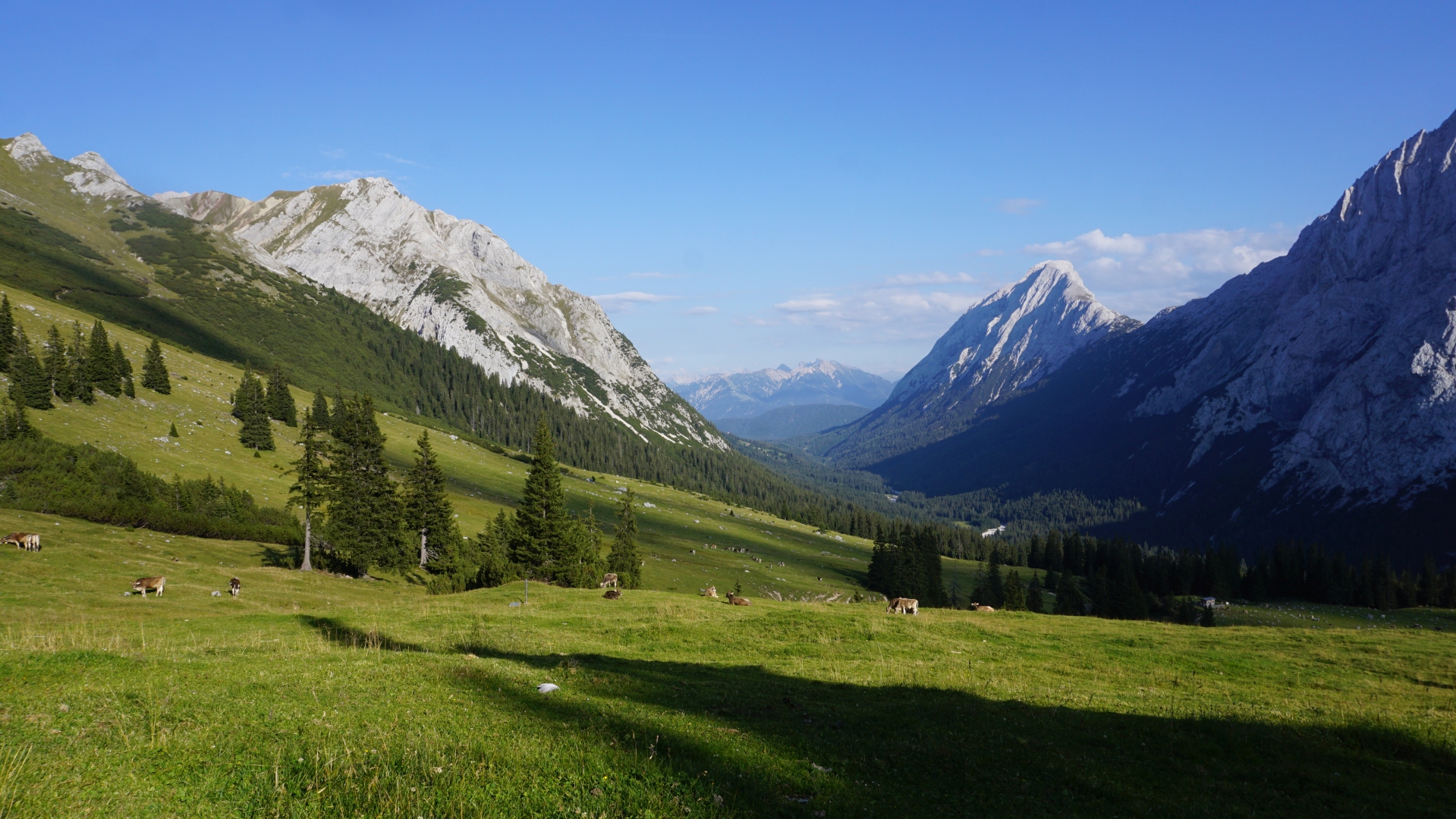 Ich wandere weiter zum Gatterl (Grenze D-AT), dieser Steig ist rot markiert. Ab hier ist es endlich ruhig, der Blick ins grüne Reintal erfrischend nach der Geröllwüste. Am Gatterl treffe ich noch eine ortsansässige Alleingängerin, mit der ich bis zum Feldernjöchl gehe. Ein Ratsch mit Gleichgesinnten zwischendurch ist immer schön. Sie zweigt nach Leutasch ab, ich steige über den Sattel „Am Brand“ zur Hochfeldernalm ab. Ich folge noch ein Stück dem Max-Klotz-Steig, dann ist es leider vorbei mit den schönen Almwegen und es geht über die Forststraße zur Bergstation der Ehrwalder Almbahn. Der Abstieg zur Talstation ist wieder gut bevölkert. Dort stelle ich fest, dass ich gerade den letzten Bus verpasst habe. Notgedrungen latsche ich also noch 4,5 km weiter zum Bahnhof Zugspitzbahn, der leider ein Stück außerhalb von Ehrwald liegt. Am Viadukt probiere ich, ob mich nicht vor dem nächsten Zug ein Auto mitnimmt. Keine 5 Minuten später hält ein Taxifahrer, der mich kostenlos mitnimmt, weil er eh Kunden in Hammersbach abholen muss. Echt nett, die Österreicher! Mit diesem positivem Schlusserlebnis endet ein ausgefüllter Bergtag.